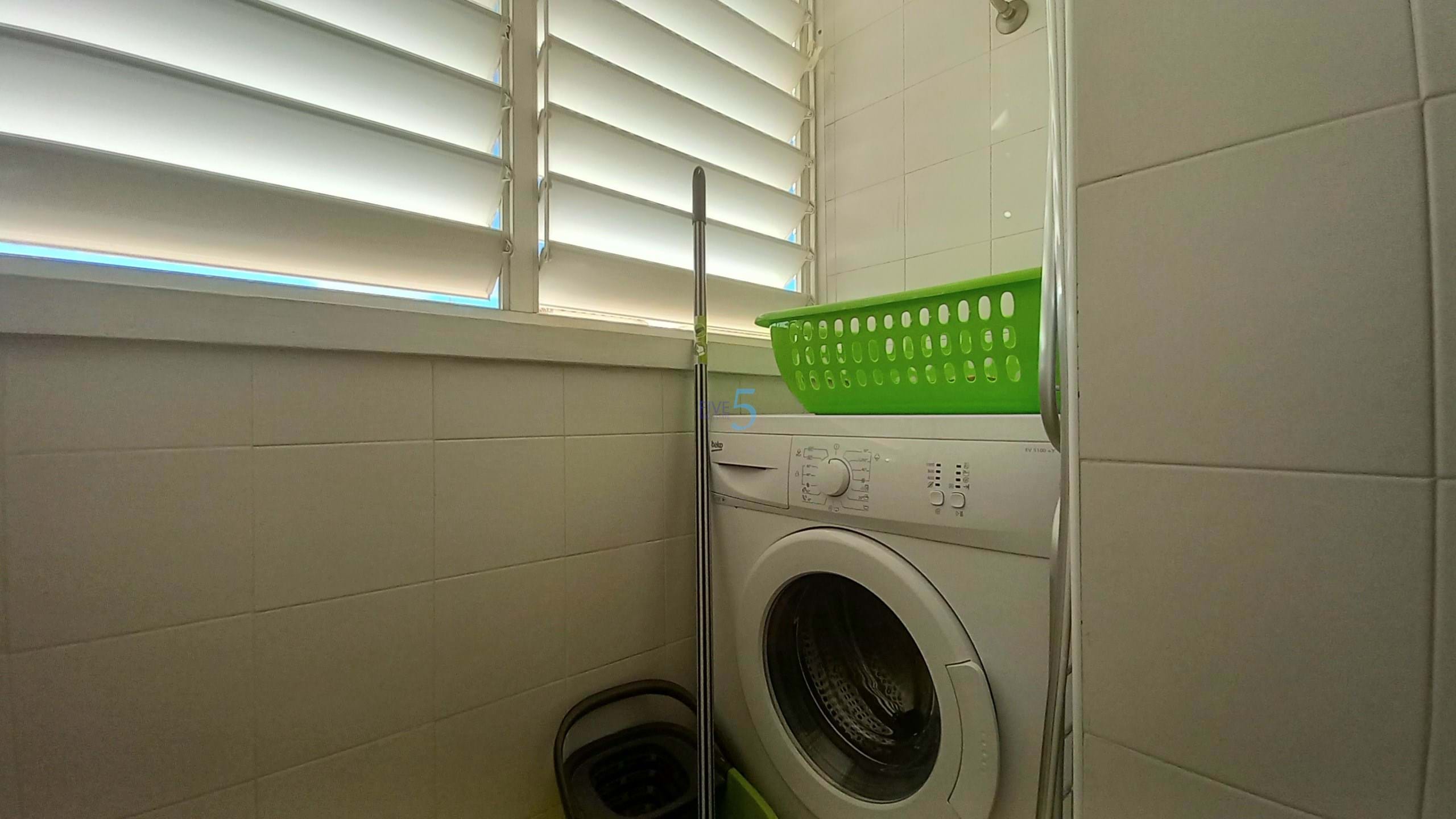 Inside, the property boasts a spacious living room equipped with air conditioning and access to a west-facing balcony that overlooks the serene park, providing a lovely space to unwind. The separate fully fitted kitchen features ample storage and includes a utility room with a washing machine for added practicality.