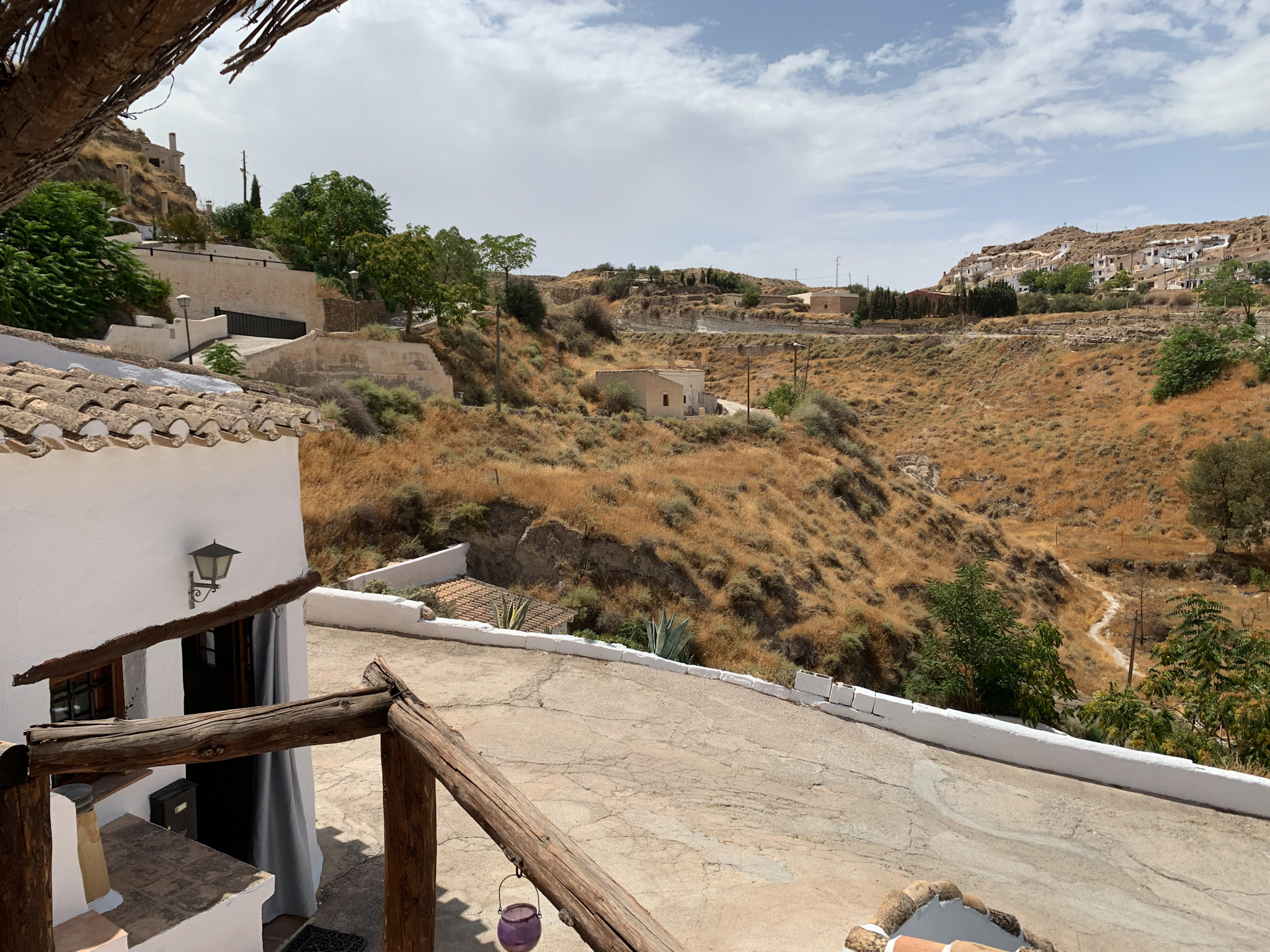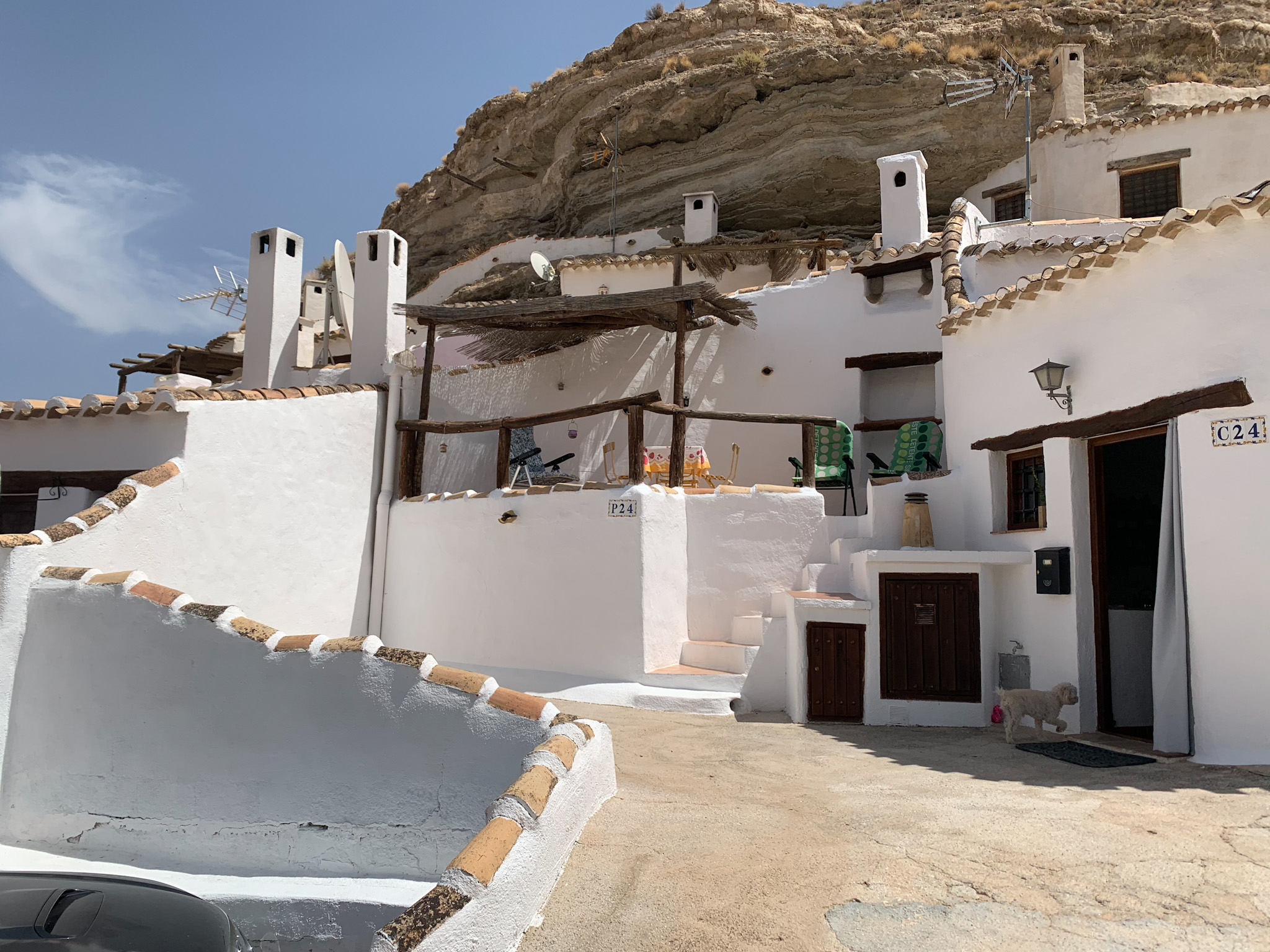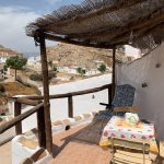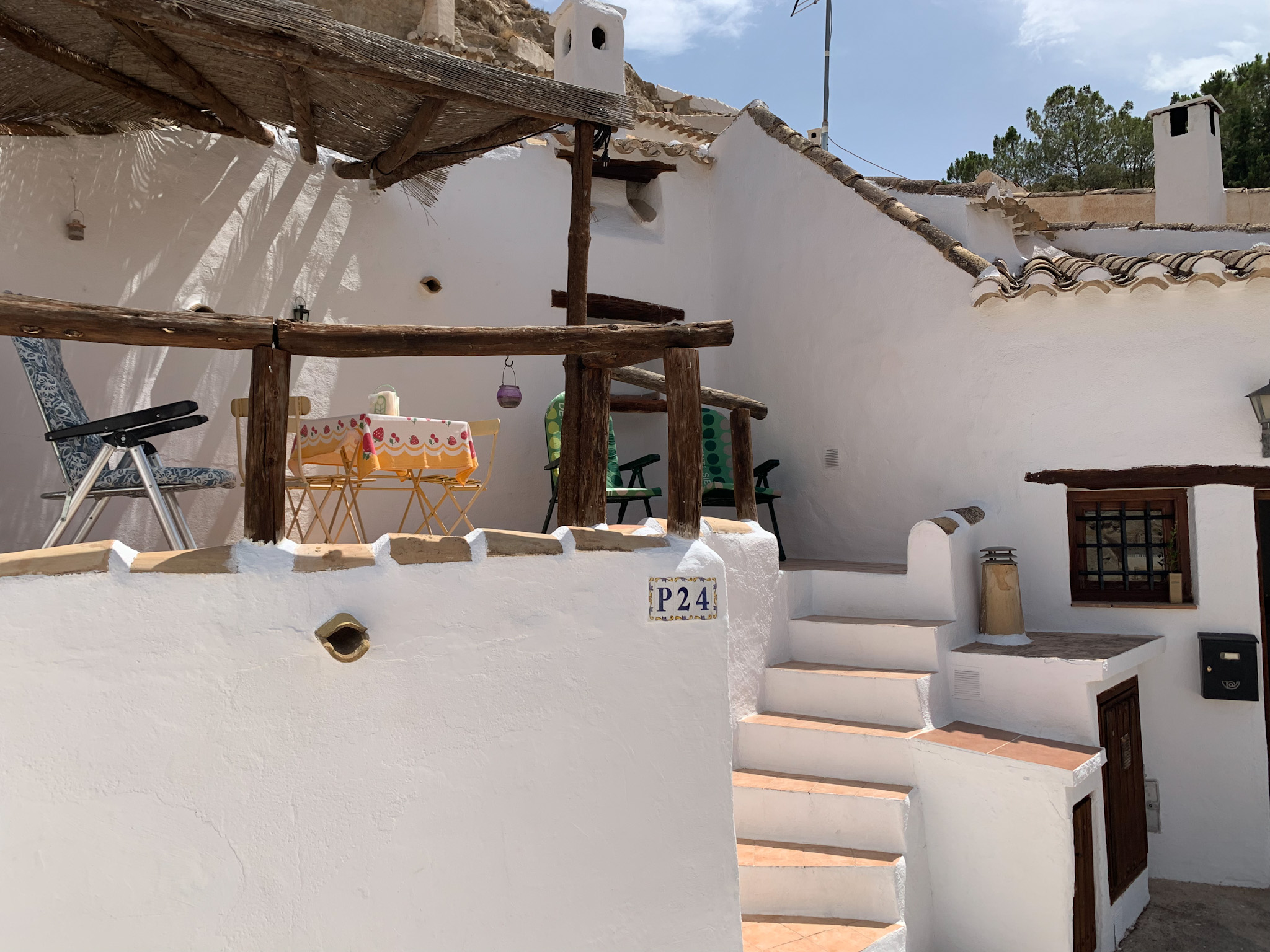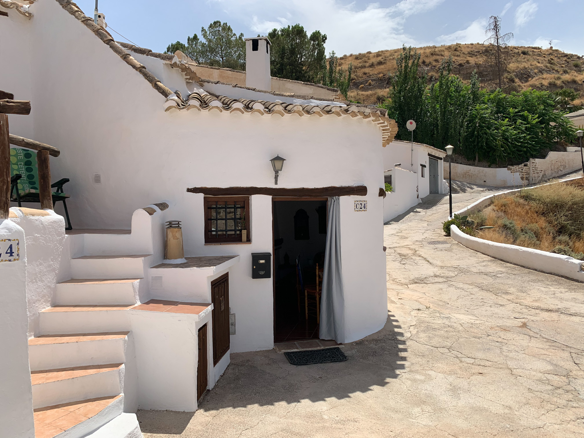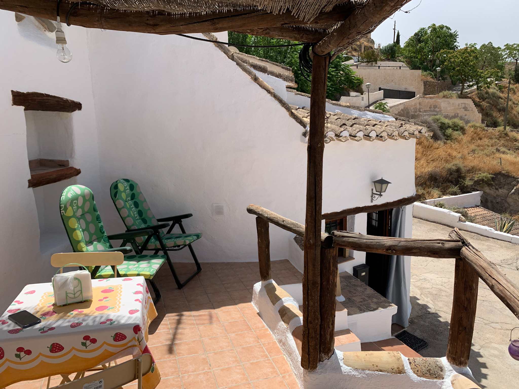 The raised patio is set back from the road and is just the right size, with both a covered sitting area and space for sunning. There are storage cabinets next to the front door. This is a delightful spot for watching the sunset or relaxing with tapas and wine. This quality cave property is a rare find for this price in Galera.