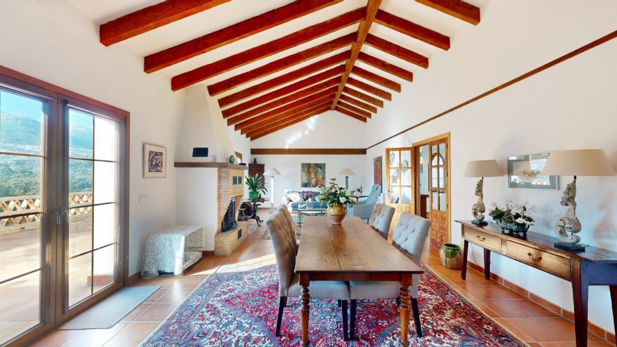 Fabulous and impressive living room, which has high vaulted wood beam ceilings , a majestic fireplace fitted with wood burner. Two seating areas , Two sets of double French windows giving access to the full length terrace running along the South facing side of the house . Views are breathtaking !