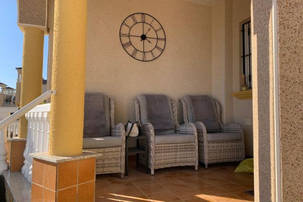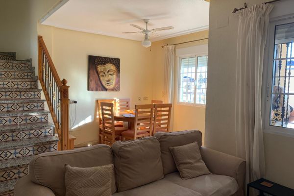 An exceptional quad townhouse, south facing and located on an elevated plot offering wonderful views over the surrounding area down towards the salt lakes and beyond. This is a very nicely presented 3 bedroom property set on a large plot of approx. 200m2 with a large tiled terrace for relaxing and sunbathing with various seating areas, a gazebo and storage space. You enter the house of approx. 100m2, via a couple of steps onto a covered terrace and leading into the open plan dining and lounge area bathed in natural sunlight with air conditioning and ceiling fans, with a spacious fully fitted kitchen. Also on the ground floor is a double guest bedroom with fitted wardrobe, air conditioning and a ceiling fan, plus a large shower room with a utility area. An elegant staircase leads to 2 further double bedrooms each offering air conditioning, ceiling fans and fitted wardrobes, one also boasting a private south facing terrace off with lovely views and there is a large bathroom with bathtub and overhead shower. From the landing you will find access to a further staircase with storage facility, leading to the huge solarium, again with those wonderful views down to the lake and a purpose built gazebo with sun awnings to three sides allowing for the area to be almost totally enclosed for the cooler evenings. This ôZodiacoô style townhouse is to be sold fully furnished to a high standard with many extras including aircon throughout, ceiling fans in all rooms, fitted wardrobes, wall heaters to the bathrooms, white goods and storage space, private off road parking and ample street parking, plus access to the large communal pool and sunbathing terrace located just a stroll away. It is in a great location being just a couple of minutes walk to a selection of restaurants and bars, a farmacia, mini-market and the local bus route into the centre of Guardamar and its stunning blue flag beaches