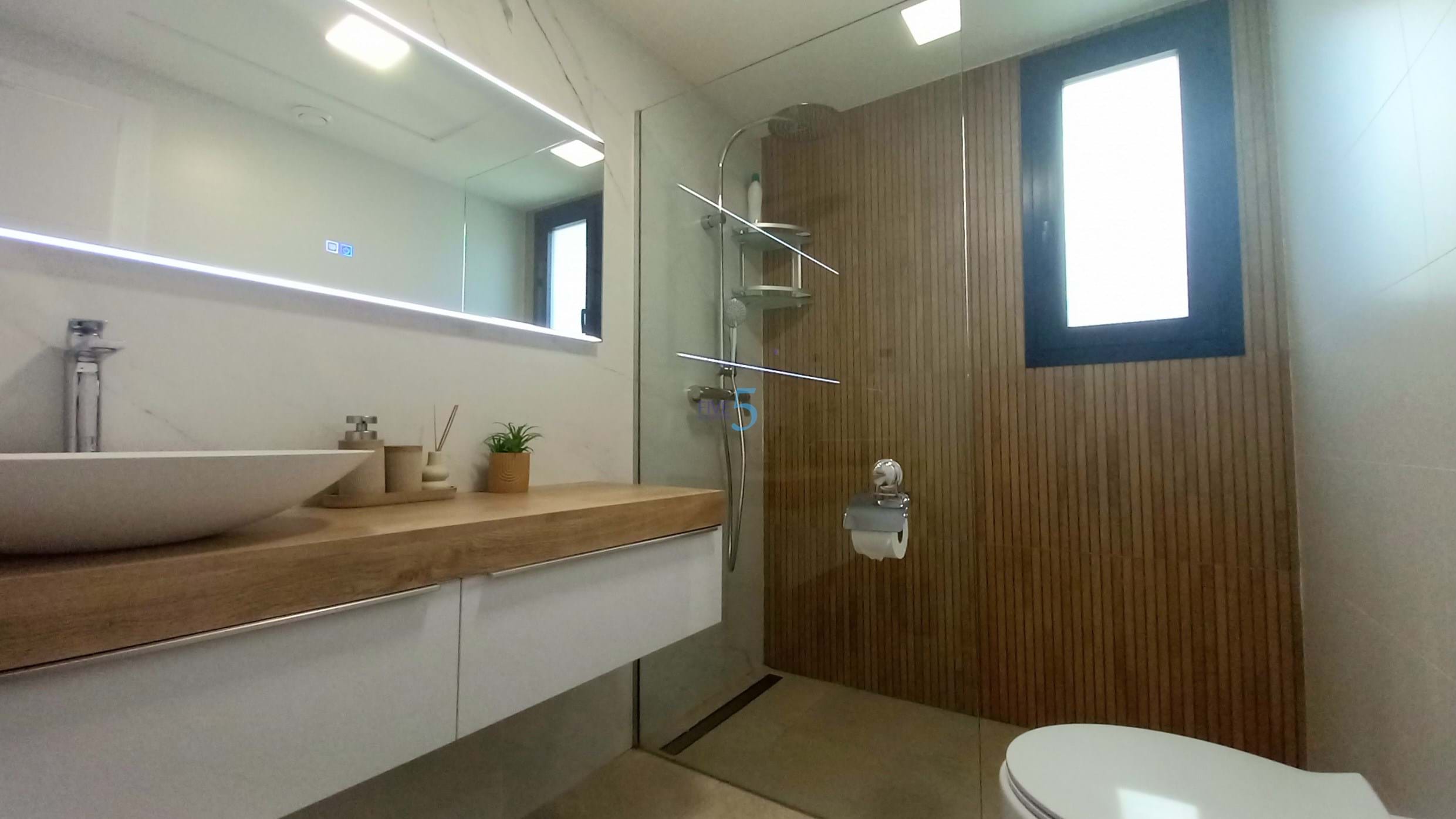 Upstairs, there are two additional double bedrooms, both with fitted wardrobes, and a shared modern shower room. A terrace on this level comes with preinstallation for a jacuzzi, adding to the homes luxury appeal. A private rooftop terrace, equipped with solar panels, offers stunning countryside views and ample space for relaxation.