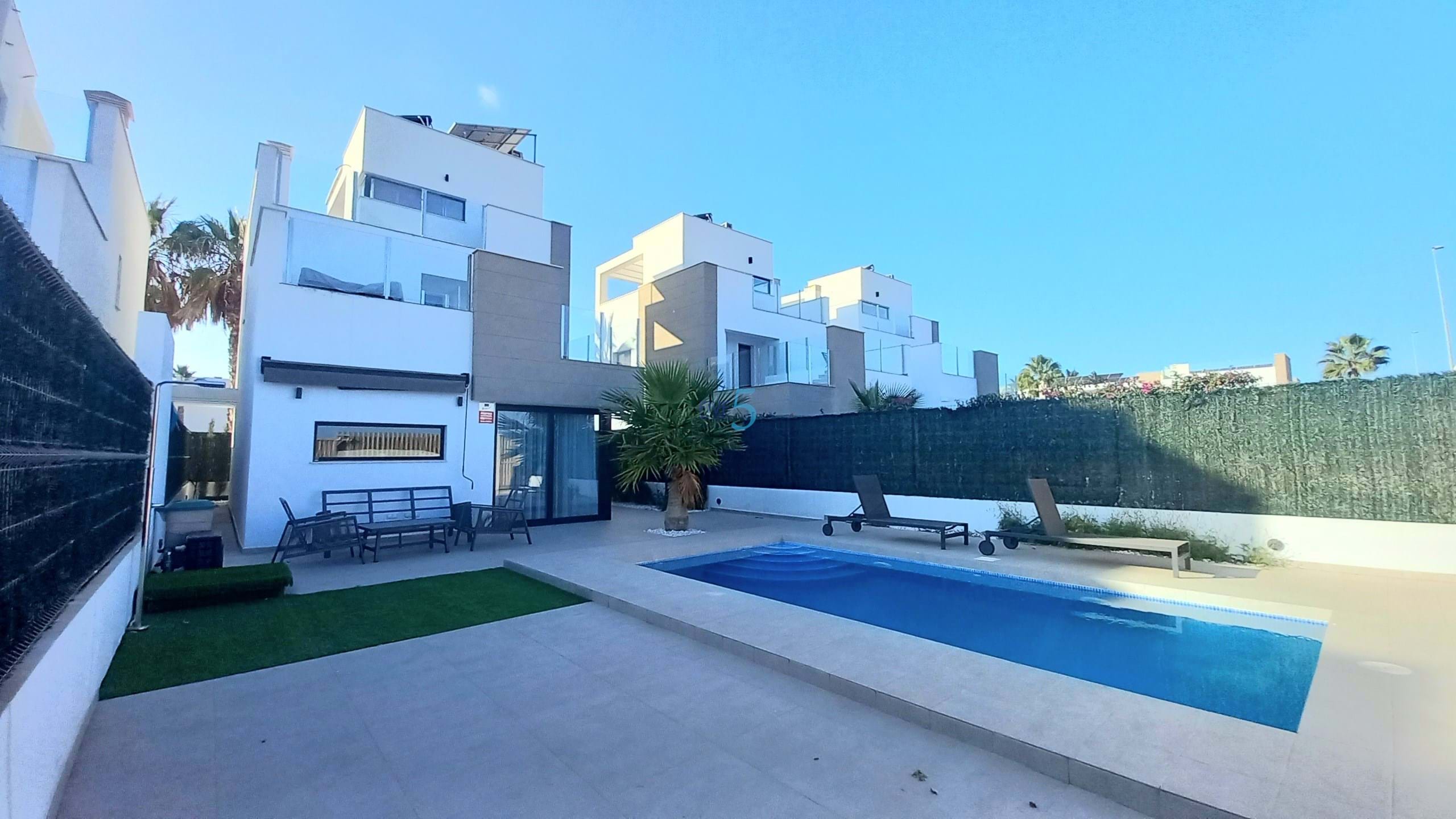 This stunning new build-style villa in El Raso offers a blend of modern comfort and convenience, located close to local amenities and just a short drive from the beautiful beaches of Guardamar del Segura. The property features an east-facing front garden and terrace, a private heated pool, and a gated driveway with electric gates.