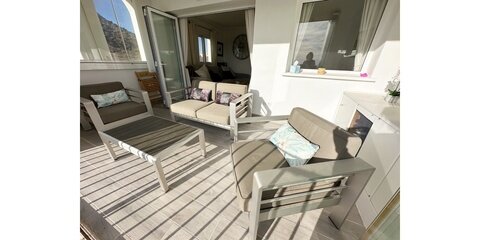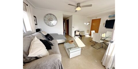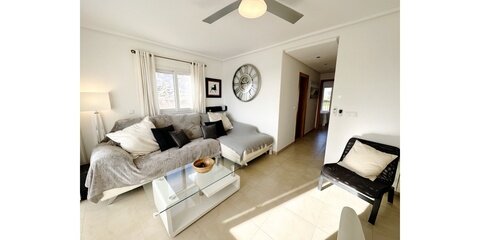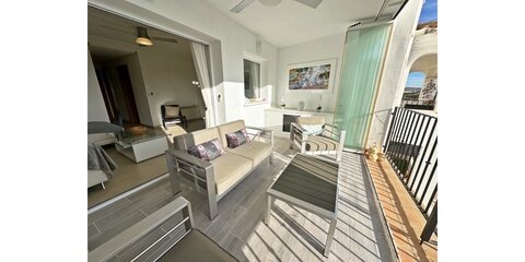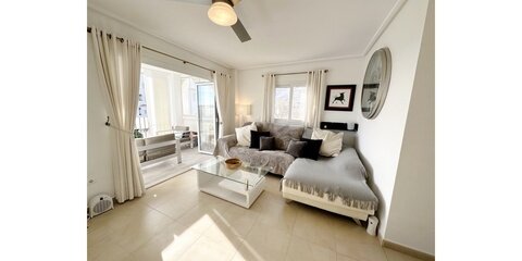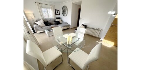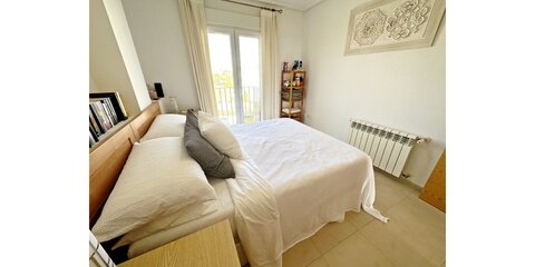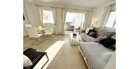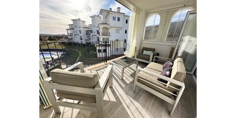 MGP Golf and Coastal are excited to offer this wonderful South east facing, second floor apartment for sale on the beautiful Hacienda Riquelme Golf Resort. The two bedroom apartment has had numerous modifications including glass curtains and new flooring on the terrace, bifold patio doors from the lounge to the terrace, completely refitted bathroom and aircon throughout. It is being sold furnished with gas central heating throughout and allocated secure underground parking with lift access to the property. On site you have the stunning El Cason clubhouse bar and restaurant and a supermarket. The village of Sucina is a 5 minute drive with numerous bars and restaurants and a 20 minute drive to Murcia airport and the beaches of the Mar Menor. This well presented apartment has a spacious sunny lounge diner with bifold patio door access to the wonderful terrace. The owners have installed glass curtains creating an additional year round use room. The floor tiles are new and the aircon units have been enclosed creating some cupboard space. The terrace has gorgeous views over one of the pools and golf course. You'll find a modern galley style kitchen, newly fitted bathroom with large walk in shower and vanity unit. There are two double bedrooms both with fitted wardrobes and juliet balconies. This is a wonderful property. Viewing essential as it won't be available for long! Contact the MGP office on 00 34 868 11 00 11 for a viewing with one of our agents.