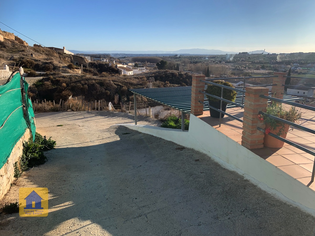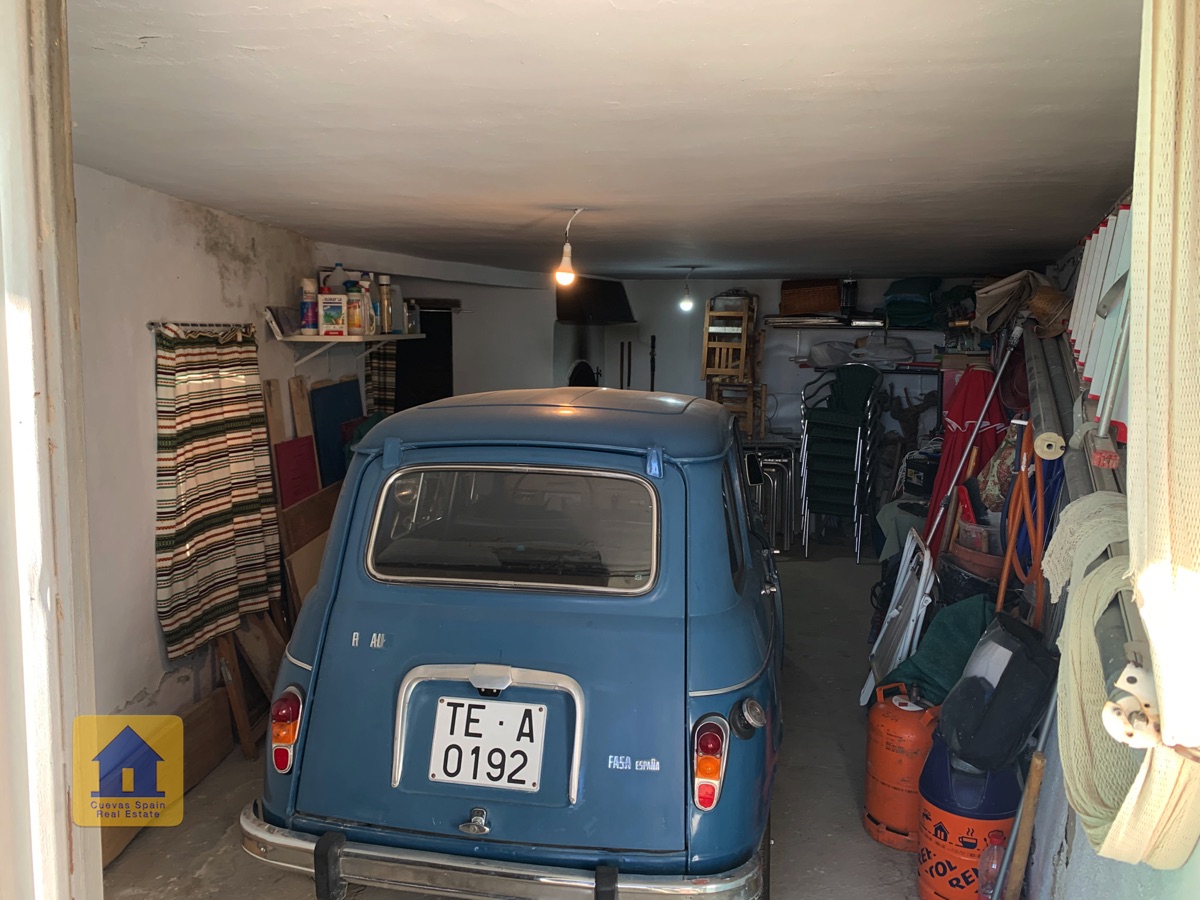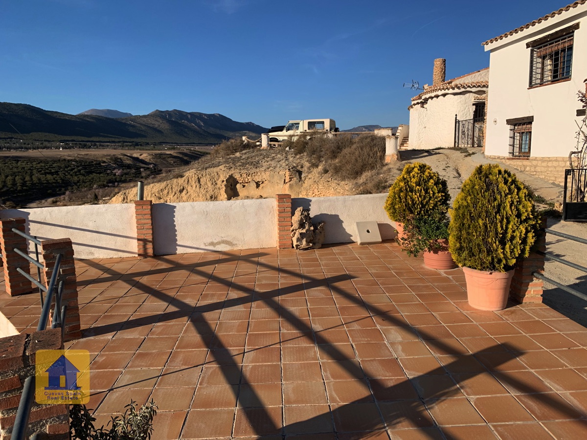 The cave has a covered front patio for outdoor dining and a large, fully tiled terrace that gets sun all day. Below the terrace is a one-car garage with additional parking space in front of the garage. The garage has a wood oven. The track to the house is narrow and passes between the cave house and the terrace and garage. This track continues through a small neighbourhood and exits up a hill onto a wide open plains with mountains in the distance. A beautiful community swimming pool and recreational park is just a 2 minute drive or 15-20 minute walk. There are a couple of nearby restaurants and basic shops. The lively Huéscar town center is a 5 minute drive with shops, restaurants, schools, a 24 hr health center, two theaters and a busy weekly market.