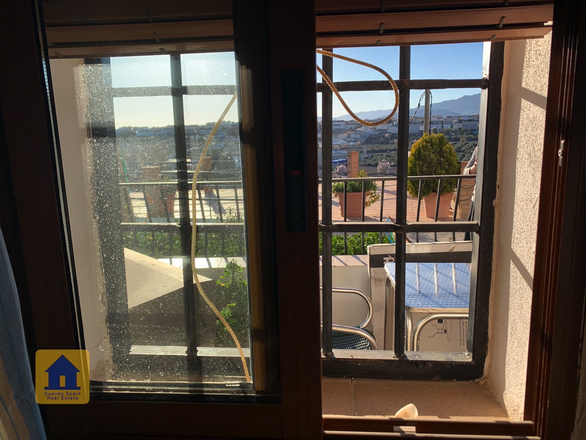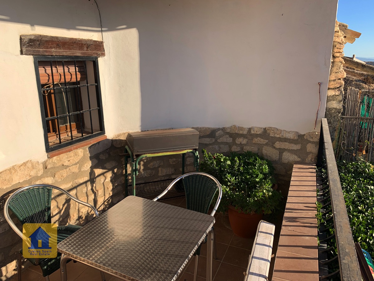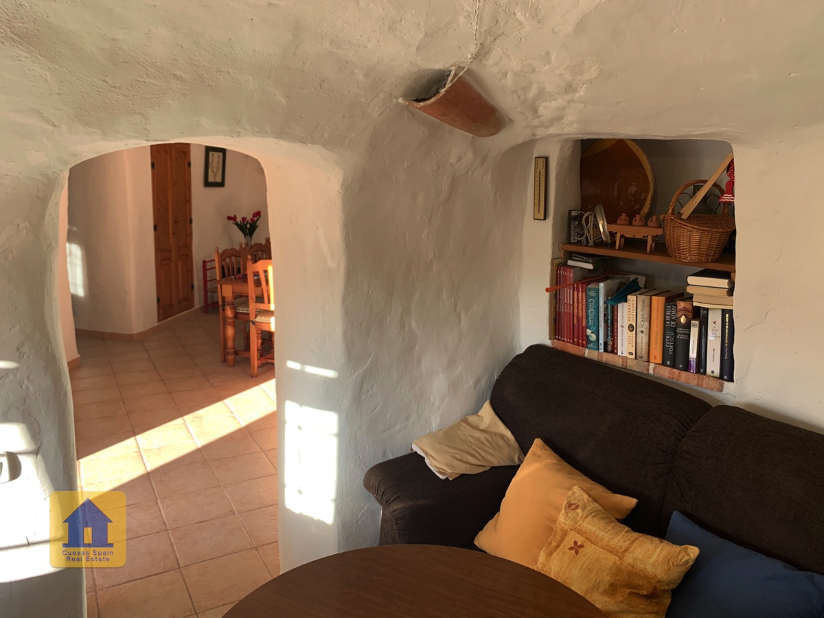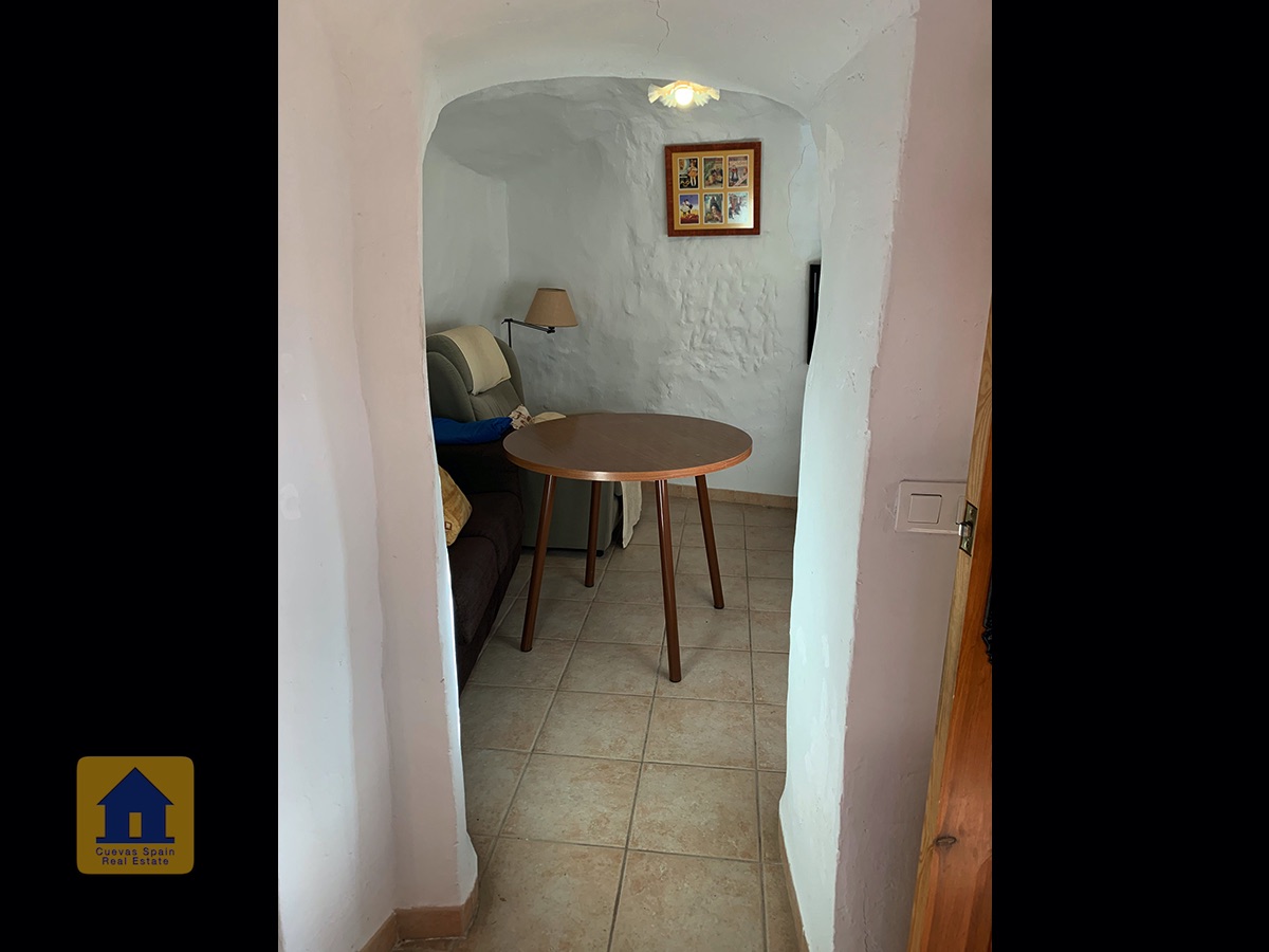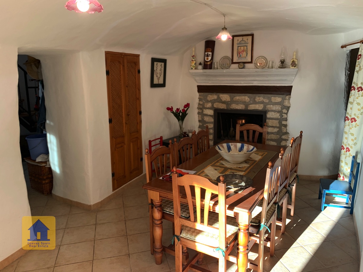 This cave house is situated in the heights of Huéscar with stunning southwest views of the town and surrounding mountains. This house is pure cave except for the beautiful upstairs bedroom with mansard roof. The style is traditionally Spanish with a quirky character. You enter the cave house through the dining room. There is a snug and a bedroom to the right, and a bedroom with bunk beds off the dining room. To the left is a short hall to the bathroom and kitchen with adjoining eating area and pantry. A staircase leads up from the kitchen to the ample double bedroom. The large bedroom window is positioned to offer dist ant views from the bed! This bedroom has built-in cupboards and a door that leads to the land above the cave. This cave house has been carefully renovated and is maintained in excellent condition.