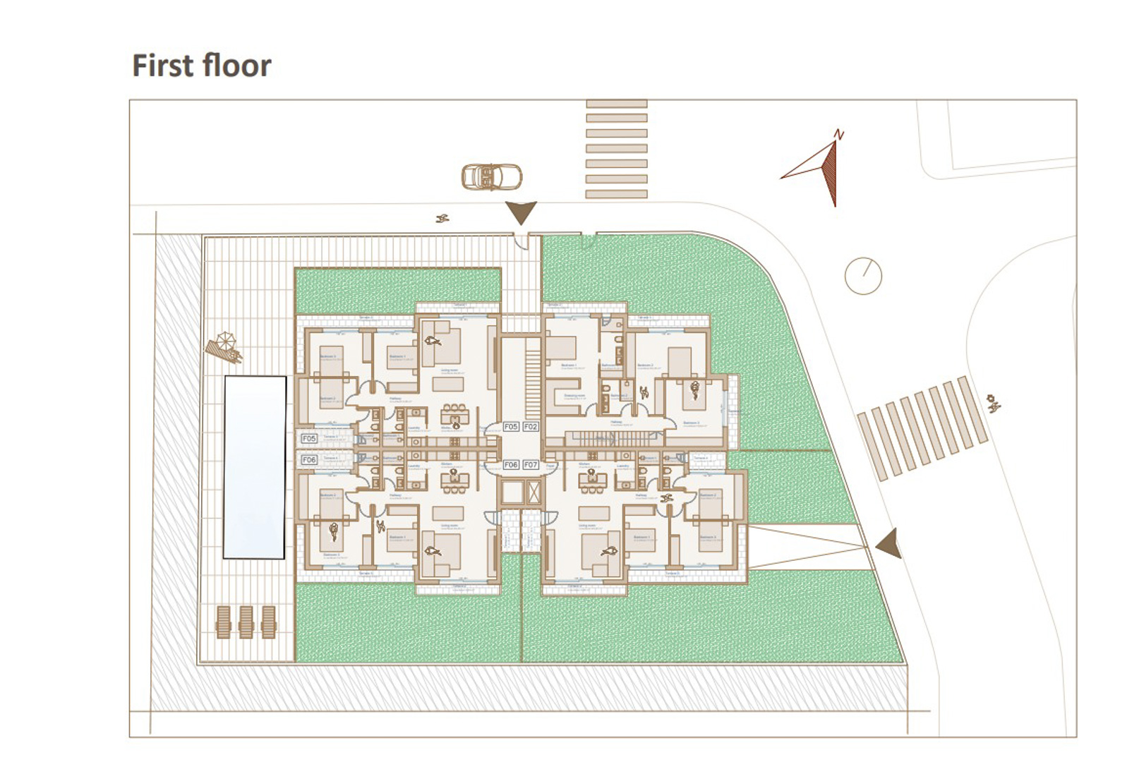 The complex offers a communal swimming pool with sunbathing area.