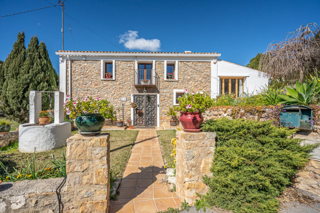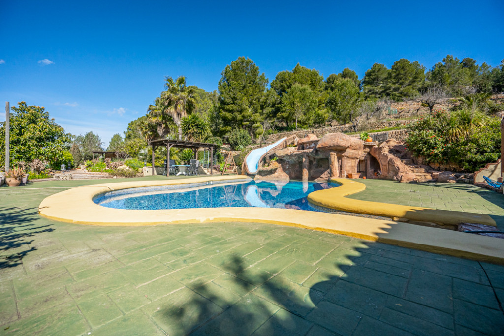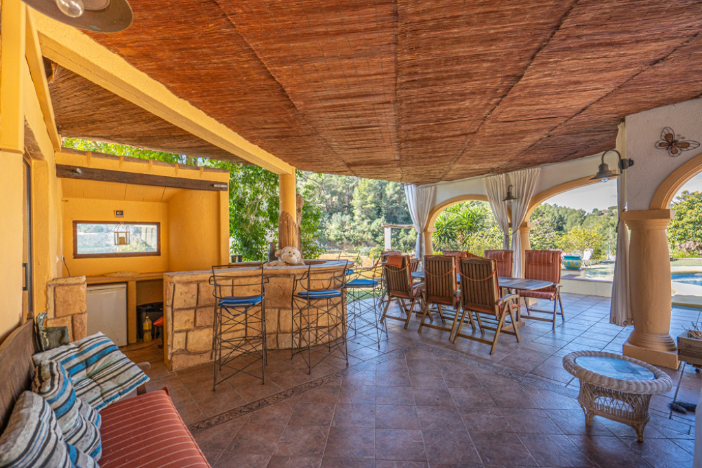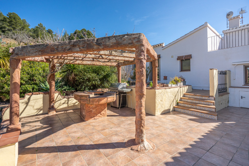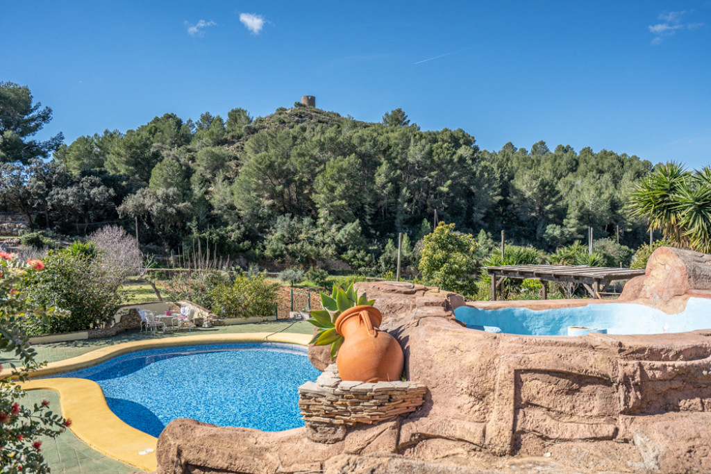 Surrounded by mountains and forests, on the edge of a small, charming village stands this beautiful villa. Situated on a plot of over 6000 m2 with panoramic views over the valley and the mountains, you will enjoy pure peace and nature here. Through the front door you enter the house in a spacious hall with a bedroom to your left and your right, walking further you enter a first lounge and a staircase hall, adjacent you will find a dining room. Next to the dining room is a living room with an open kitchen. Through the kitchen you enter a corridor with a bathroom, a second kitchen, an office that could serve as a fifth bedroom, a gym and a storage room. Upstairs are two more spacious double bedrooms, a large hallway with a dressing room and a bathroom. The master bedroom has several large windows that provide plenty of natural light. Through the windows you can enter the spacious terrace from where you can enjoy beautiful mountain views. The living room is connected to a large covered terrace with an outdoor kitchen, a dining area and a lounge. In addition, there is a very large swimming pool fully landscaped in tropical style with a slide, ideal for children. There is also a barbecue area, a pergola with a second dining area and a large beautifully landscaped Mediterranean garden with several palm trees, plants and lawn areas. The villa also features a driveway with parking space for up to four cars. Air conditioning is provided in the living room and the master bedroom. Jesus Pobre is an authentic village, located at the foot of the southern slope of the Montgo and surrounded by many orchards. The beaches of Jávea and Denia can be reached in 20 minutes, a shopping centre with several large supermarkets can be reached in just 10 minutes and the La Sella Golf Resort is just a 5-minute drive away.