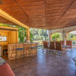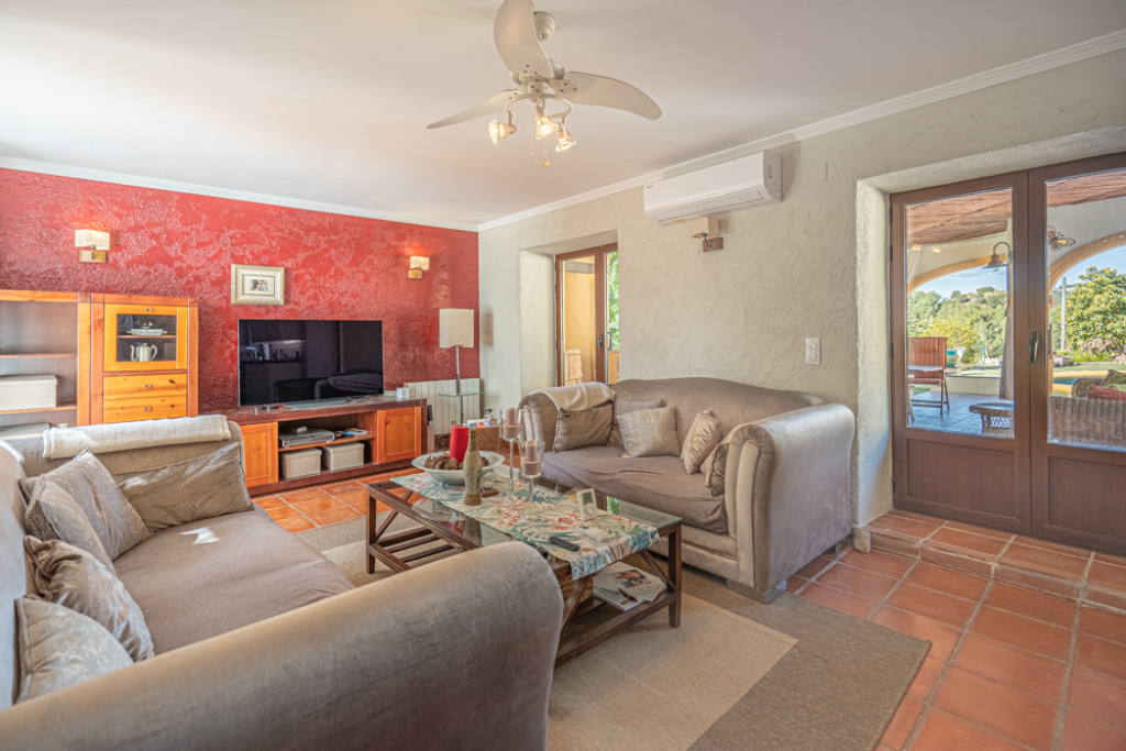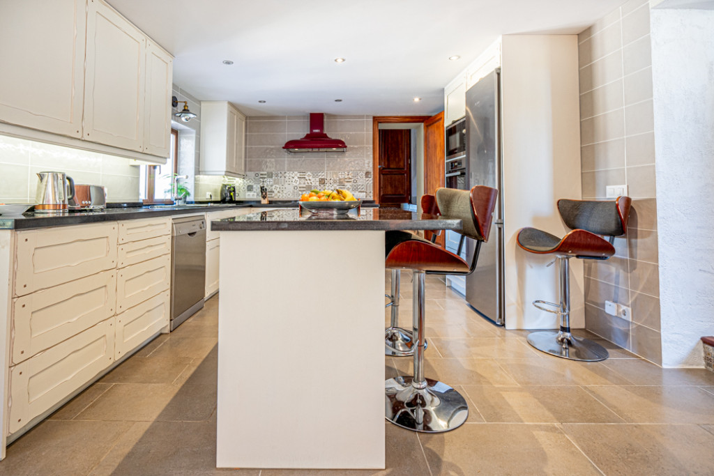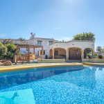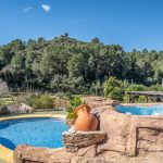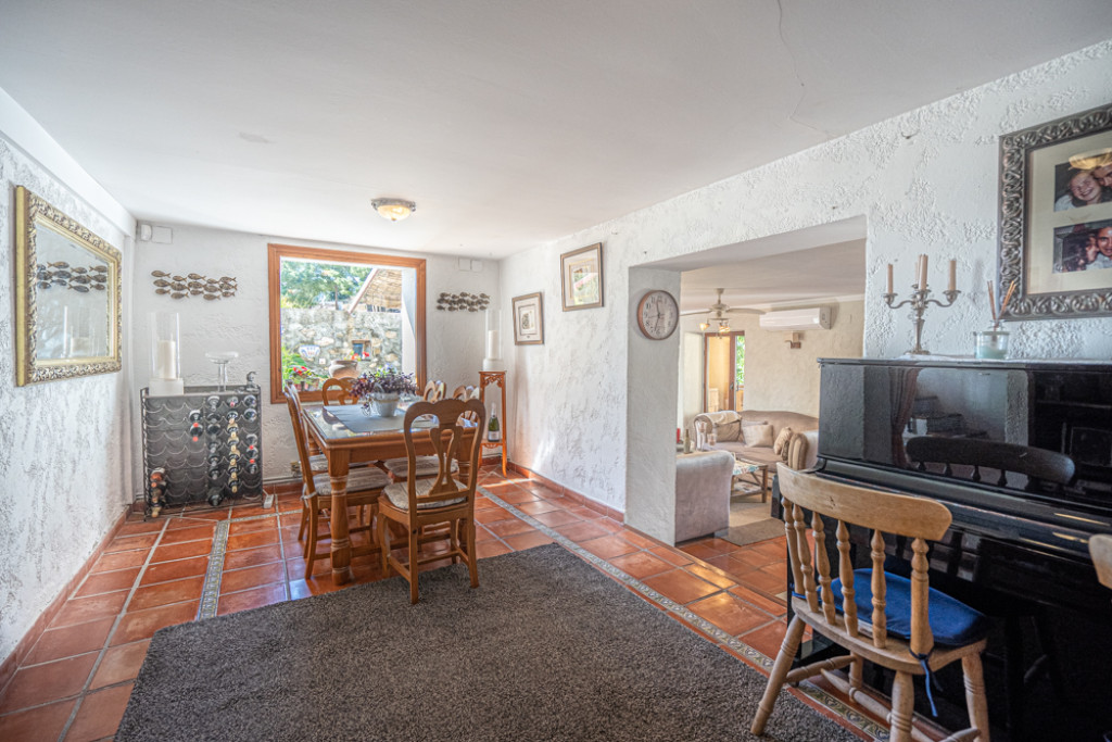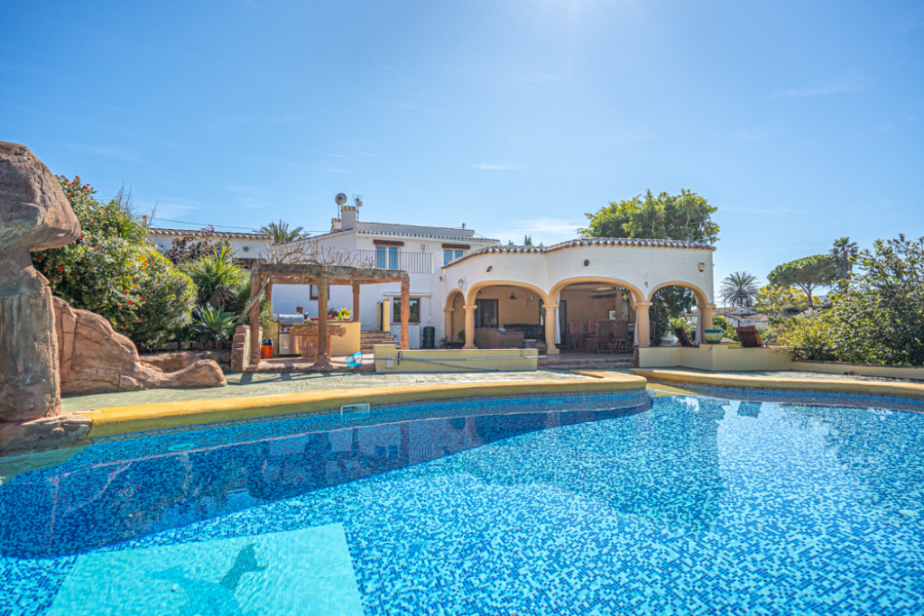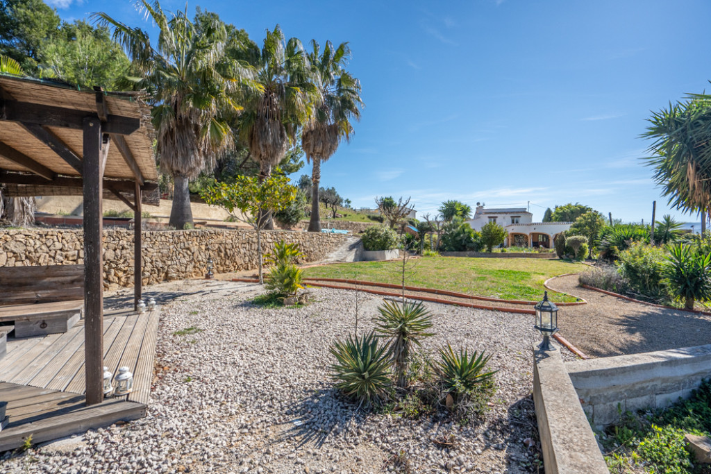 Surrounded by mountains and forests, on the edge of a small, charming village stands this beautiful villa. Situated on a plot of over 6000 m2 with panoramic views over the valley and the mountains, you will enjoy pure peace and nature here. Through the front door you enter the house in a spacious hall with a bedroom to your left and your right, walking further you enter a first lounge and a staircase hall, adjacent you will find a dining room. Next to the dining room is a living room with an open kitchen. Through the kitchen you enter a corridor with a bathroom, a second kitchen, an office that could serve as a fifth bedroom, a gym and a storage room. Upstairs are two more spacious double bedrooms, a large hallway with a dressing room and a bathroom. The master bedroom has several large windows that provide plenty of natural light. Through the windows you can enter the spacious terrace from where you can enjoy beautiful mountain views. The living room is connected to a large covered terrace with an outdoor kitchen, a dining area and a lounge. In addition, there is a very large swimming pool fully landscaped in tropical style with a slide, ideal for children. There is also a barbecue area, a pergola with a second dining area and a large beautifully landscaped Mediterranean garden with several palm trees, plants and lawn areas. The villa also features a driveway with parking space for up to four cars. Air conditioning is provided in the living room and the master bedroom. Jesus Pobre is an authentic village, located at the foot of the southern slope of the Montgo and surrounded by many orchards. The beaches of Jávea and Denia can be reached in 20 minutes, a shopping centre with several large supermarkets can be reached in just 10 minutes and the La Sella Golf Resort is just a 5-minute drive away.