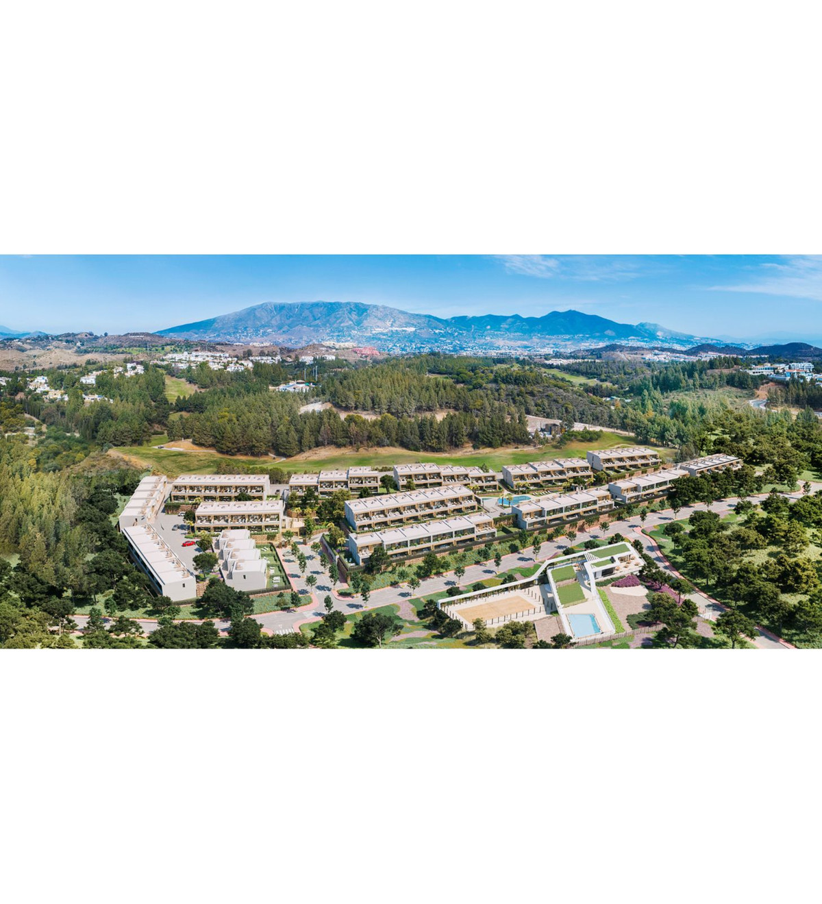 A gated residential complex with three and four-bedroom townhouses featuring innovative, contemporary, functional design that blends in with beautiful natural surroundings. As well as the landscaped gardens, leisure areas and communal outdoor pool on the complex, you also have easy access to the exclusive adjacent sports and leisure centre with its paddle courts, spa, gym etc. Additional luxury is provided by south and southwest facing homes that make full advantage of ample natural light and the enticing ambience of the Mediterranean coast. The communal spaces have been conceived and designed to reflect a strong commitment to sustainability, with top quality features and facilities found throughout the complex.