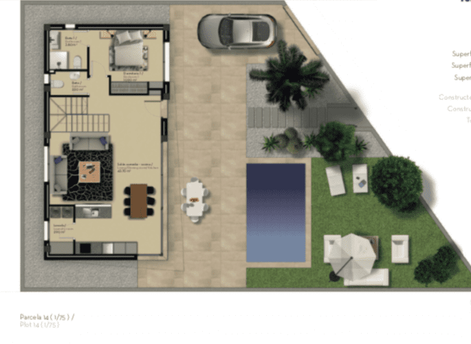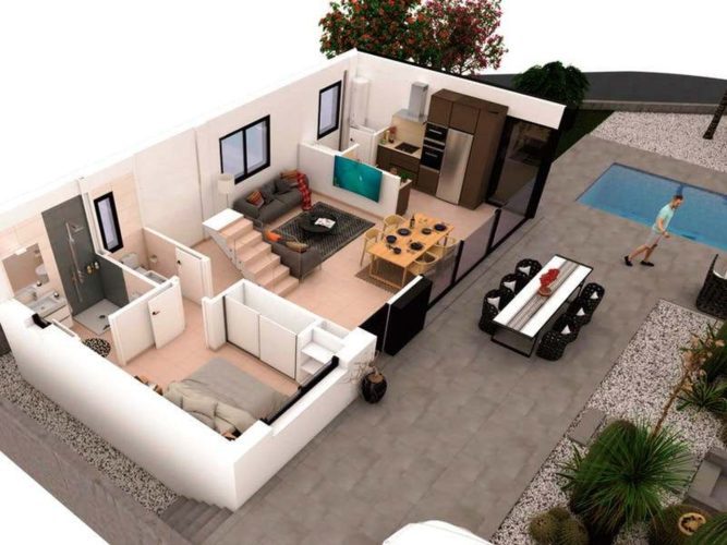 With three spacious double bedrooms and three bathrooms, an open-plan living and dining area and a fully fitted modern kitchen, the inside of this property provides plenty of space for enjoying this villa as a permanent residence or a holiday home. It is finished to a high standard, with ceramic flooring and double-glazing throughout. The villa itself has been designed to maximise the impact of the glorious Mediterranean sun, meaning the property is bright and well lit at all times. The outside space boasts a brilliant 16,90m2 terrace, a large 42,30m2 solarium and a wonderful 6x3m2 private swimming pool.