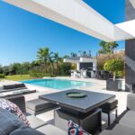Step onto the generous terrace featuring a sunken lounge, fire pit, pool, and an outdoor kitchen with a gas BBQ and hot/cold tap dining area. From here, soak in the breathtaking views of the Mediterranean sea over the golf course. The sophisticated master suite on the upper floor opens to a terrace with stunning vistas. The impressive basement level houses entertaining features like a TV area, wine bodega, and cinema room.