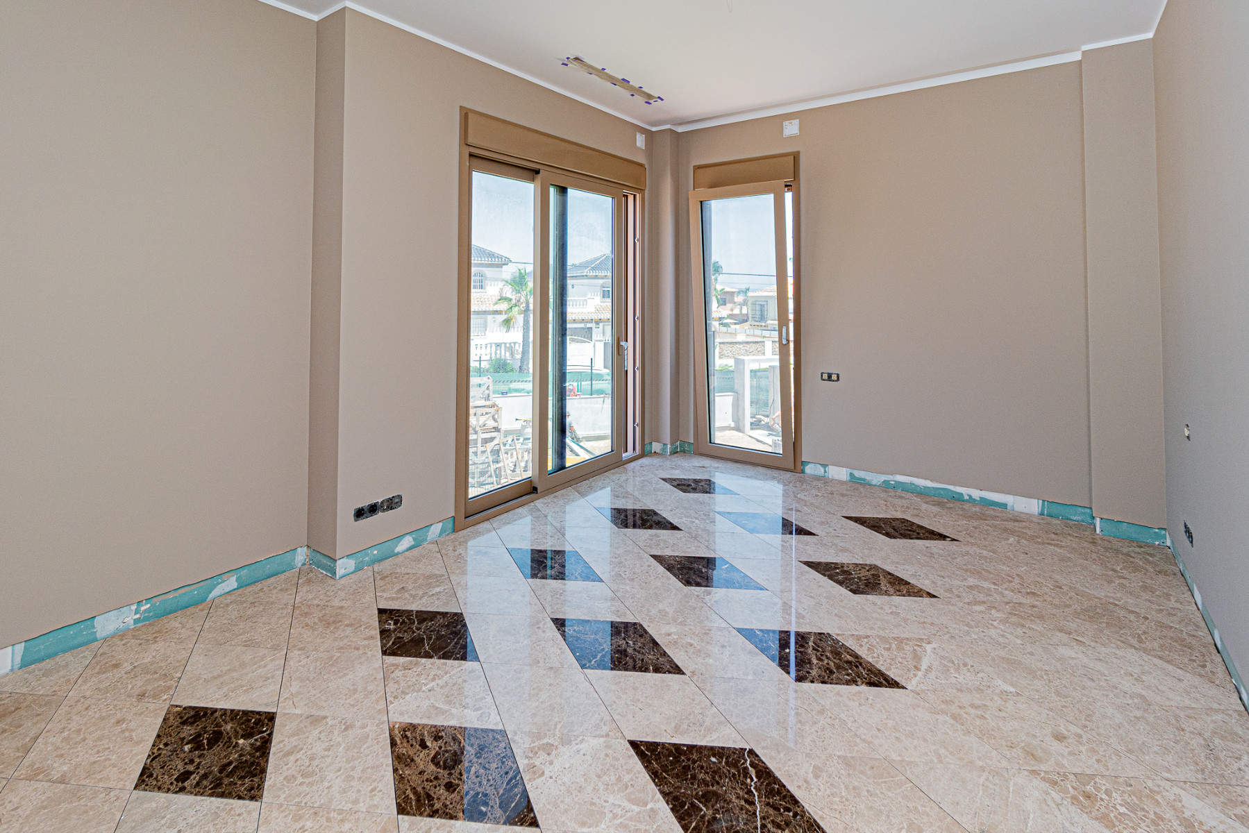 Modern new-build villa in La Mata with sea views, offering 5 bedrooms and 5 bathrooms across three levels, including a spacious underbuild. Built with high-quality materials such as natural Travertine stone, marble floors and bathrooms, and Reynaers aluminium carpentry. Features include underfloor heating with Daikin aerothermal system, heat recovery, designer Arrital kitchen, and a heated pool with waterfall and counter-current system. Additional highlights include a suspended wood-burning fireplace, motorised security shutters, and elegant finishes throughout.