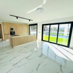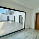 Inside, the finishes include high-quality porcelain flooring, smooth white-painted walls, and interior doors in light wood or white, adding brightness and a modern touch. The bathrooms are fully equipped with shower trays, glass enclosures, and stylish vanities, while the outdoor restroom adds convenience for poolside living.