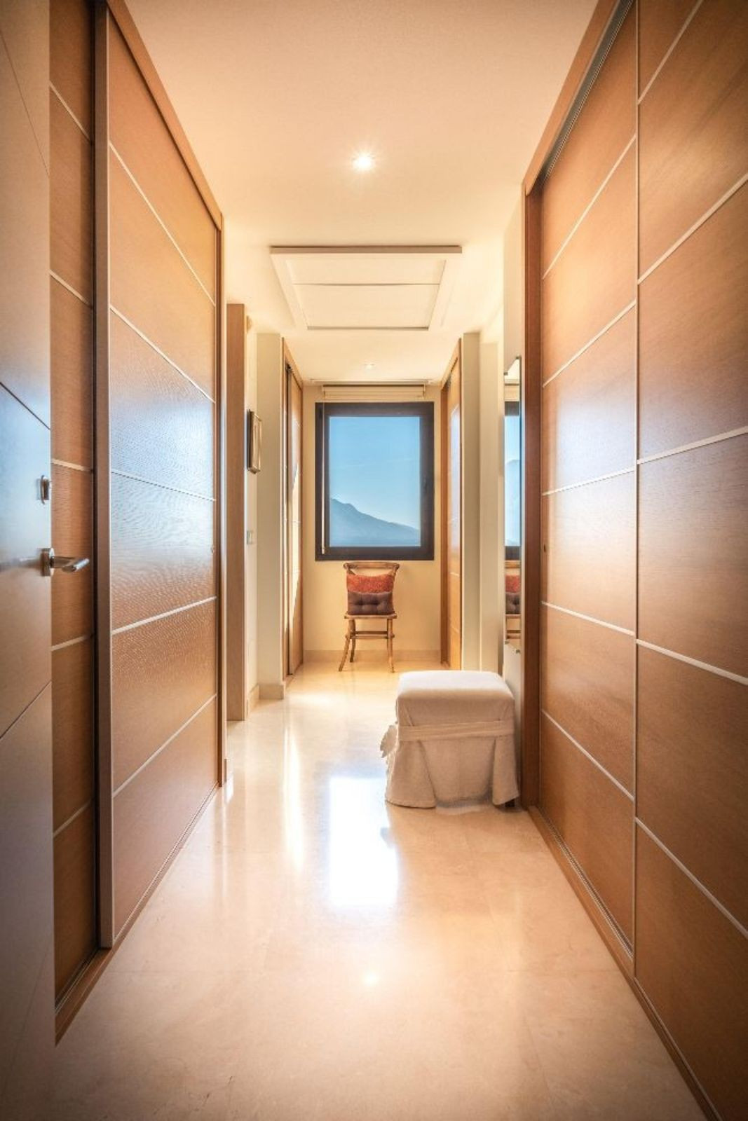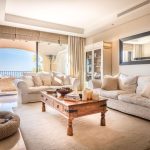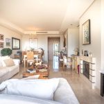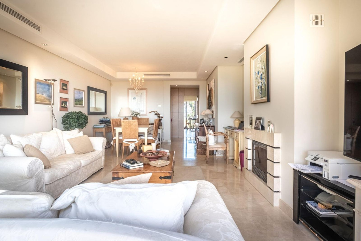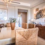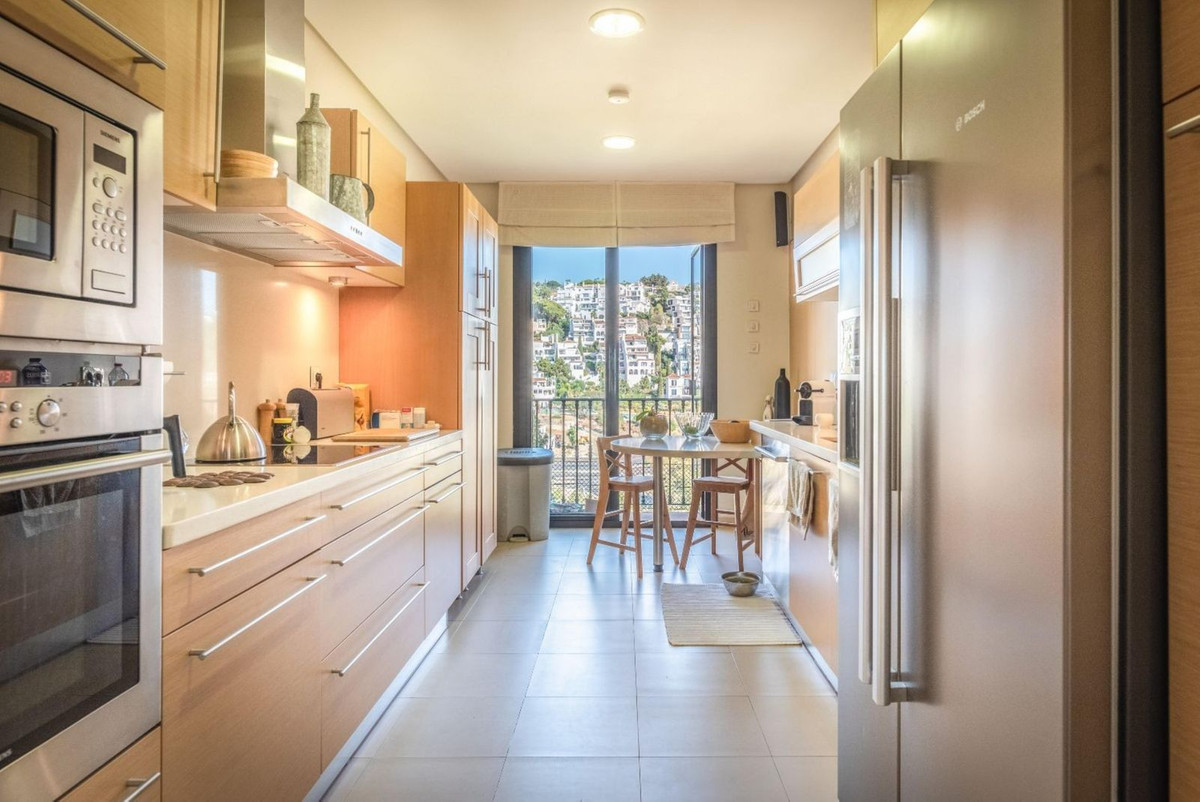 The open-plan living and dining areas are designed in a sleek, minimalist style, while the well-appointed kitchen is generous in size and equipped with high- quality appliances and views out to the mountains of Benahavis,