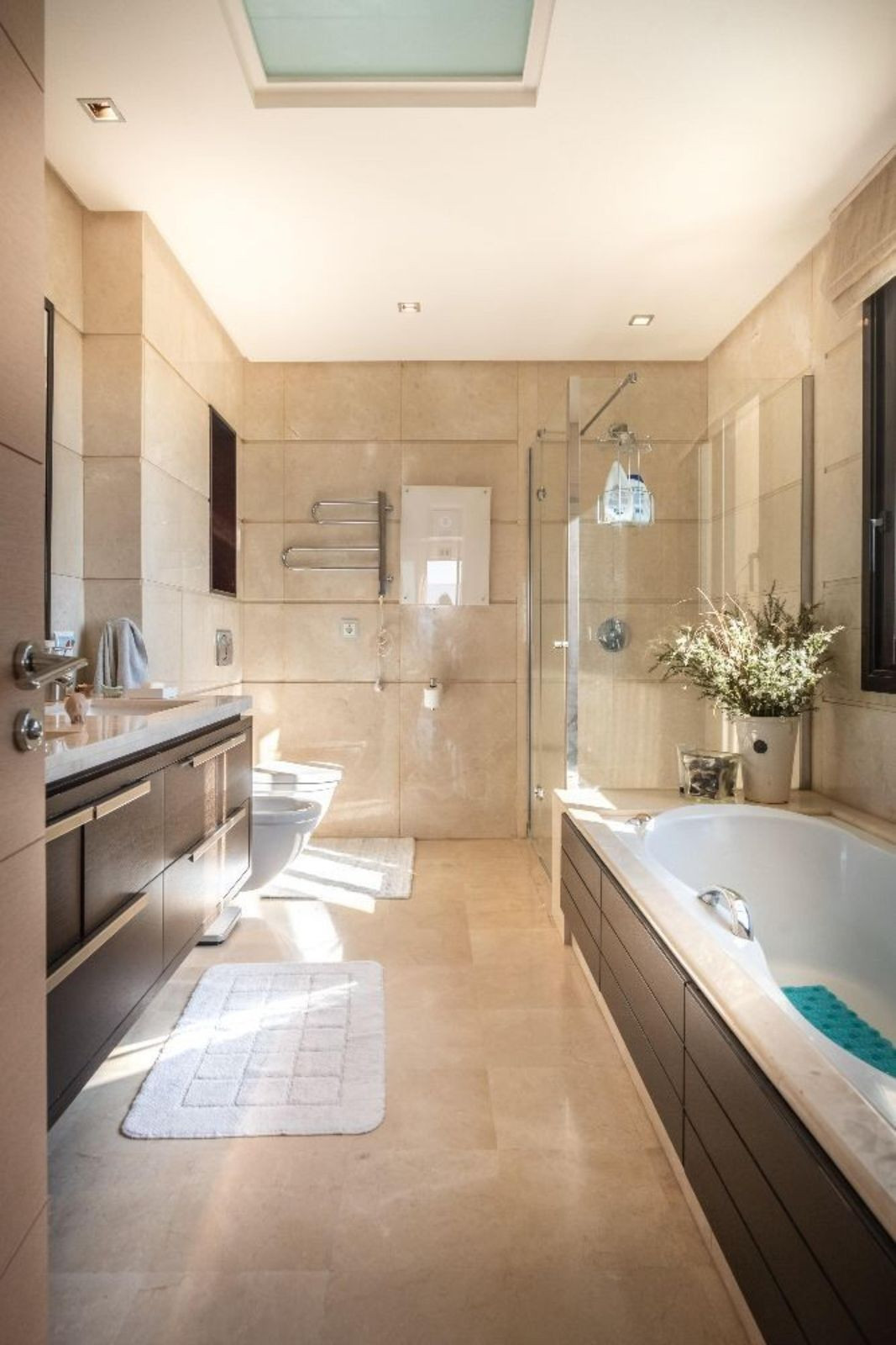 The lounge and one of the bedrooms feature patio doors that open directly onto the main terrace, and both the master bedroom and the third bedroom each come with their own small terrace. The bathrooms are elegantly designed with walk-in showers and marble finishes, enhanced by underfloor heating for added comfort.
