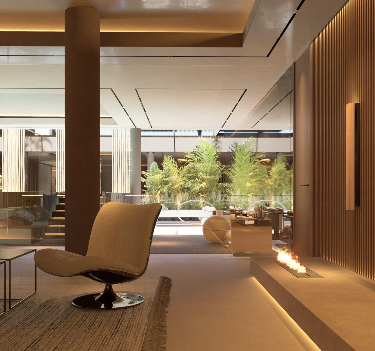 Large entrance lobby with cloakroom off, leading to a large, double aspect lounge, with feature bio ethanol fireplace and access to a huge wrap around terrace and directly to the pool, fire pit seating and cabana.