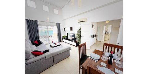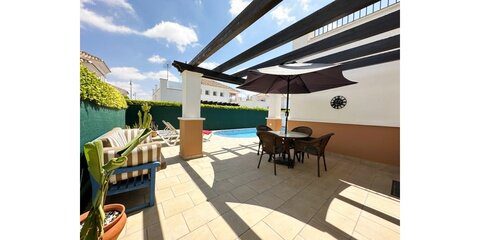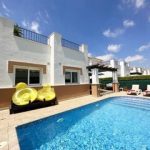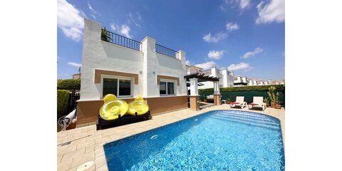 Murcia Golf Properties are excited to offer this fantastic villa Sabina with private heated swimming pool for sale on the wonderful La Torre Golf Resort. The villa is being sold furnished excluding TV with flyscreens, aircon and gas central heating throughout. All the internal doors have been painted white, giving the villa a more bright modern feel and both bathrooms have been updated. The villa is close to the town centre of the resort and a short drive to the village of Roldan. On site you have a supermarket, tennis and padel courts, the clubhouse and numerous bars and restaurants. Murcia airport is a short drive and the beaches of the Mar Menor approximately 20 minutes drive. You enter the property into the spacious hallway, with the double height lounge diner to the left. From here you have patio door access to the tiled terrace with pergola and private heated swimming pool with plenty of space to sunbathe. There is a modern kitchen with all mod cons and separate utility room. Two double bedrooms both with fitted wardrobes, the master having an ensuite shower room and a separate family bathroom with walk in shower. There is a large roof top solarium accessed from a stairwell by the front door. This is an extremely well presented and immaculate villa. Contact the MGP office to book a viewing appointment with one of our agents