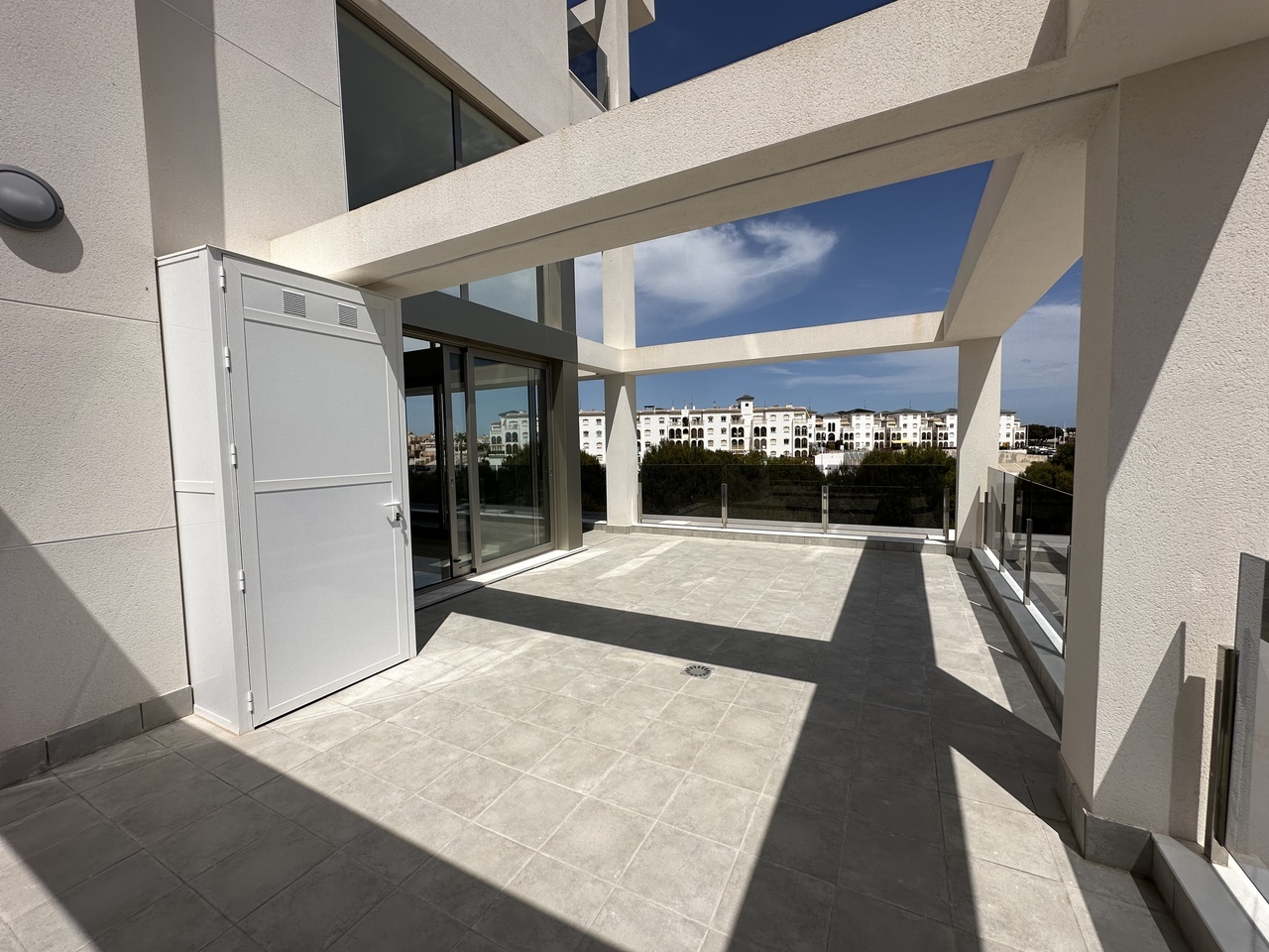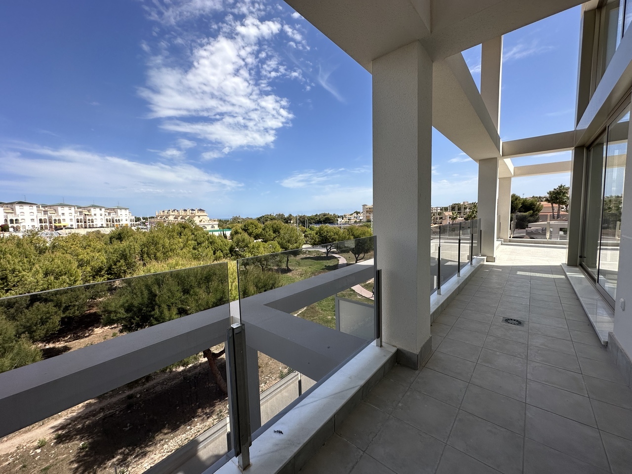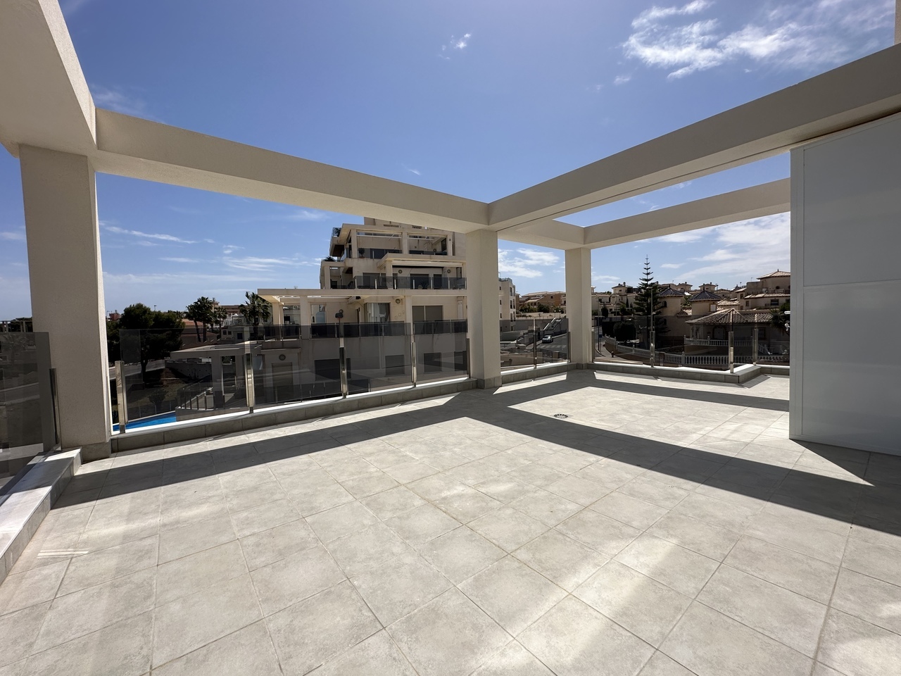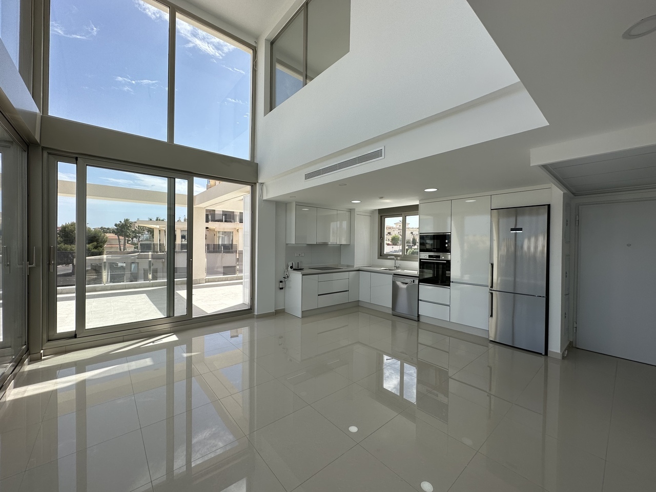 One of a kind Duplex Apartment for sale in the heart of La Zenia with impressive feature floor to ceiling windows, boasting spectaculare sea views. This brand new key ready 89m2 apartment is built over two levels with a huge living and dining area, open plan kitchen, double bedroom and guest bathroom all on the lower level. The apartment is located on the corner of the building and also enjoys a very large 56m2 private terrace which can be accessed from the main living area and ground floor bedroom. Upstairs there are 2 en-suite bedrooms both with sea views. This duplex apartment is sold equipped with kitchen appliances and white goods, pre-installation of air-conditioning, electric blinds, underfloor heating in the bathrooms along with underground parking and storage.
