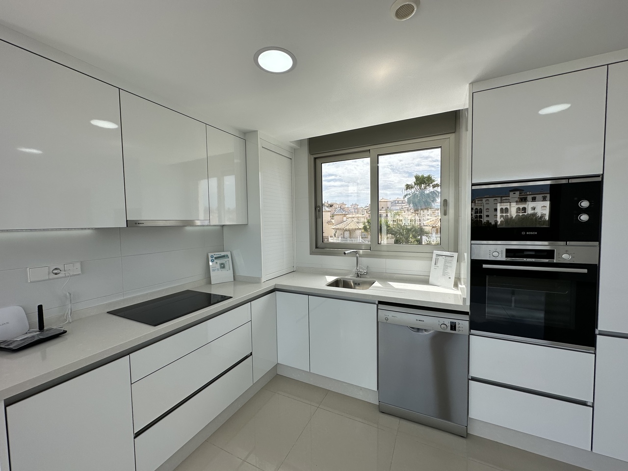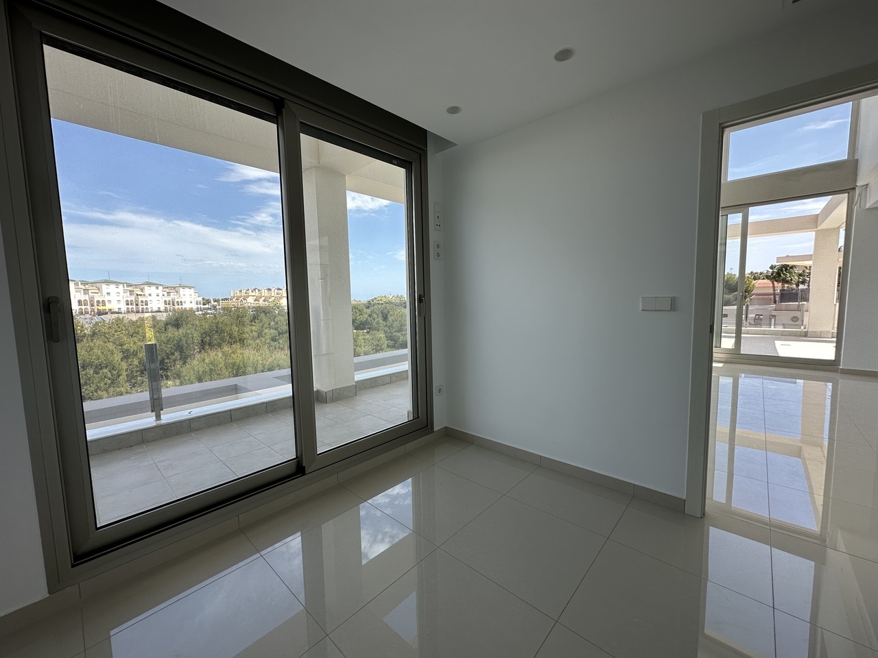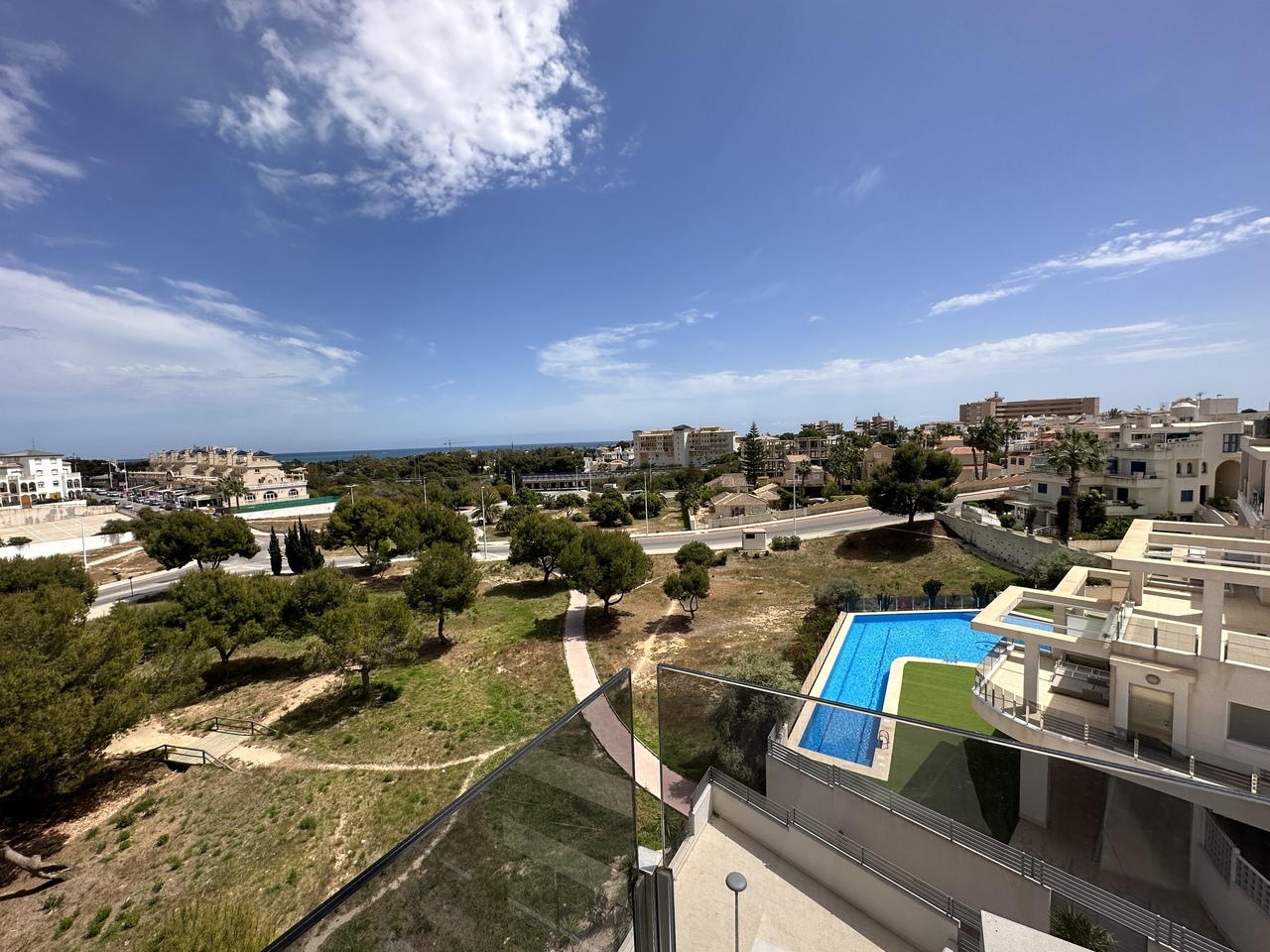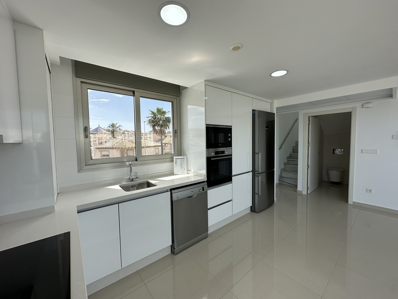 One of a kind Duplex Apartment for sale in the heart of La Zenia with impressive feature floor to ceiling windows, boasting spectaculare sea views. This brand new key ready 89m2 apartment is built over two levels with a huge living and dining area, open plan kitchen, double bedroom and guest bathroom all on the lower level. The apartment is located on the corner of the building and also enjoys a very large 56m2 private terrace which can be accessed from the main living area and ground floor bedroom. Upstairs there are 2 en-suite bedrooms both with sea views. This duplex apartment is sold equipped with kitchen appliances and white goods, pre-installation of air-conditioning, electric blinds, underfloor heating in the bathrooms along with underground parking and storage.