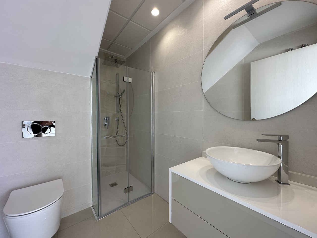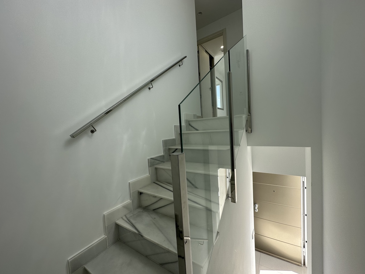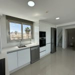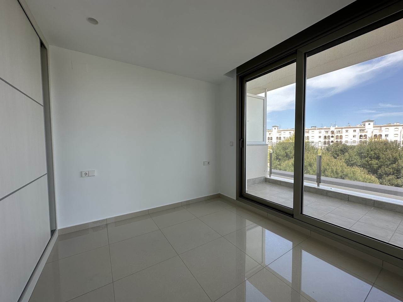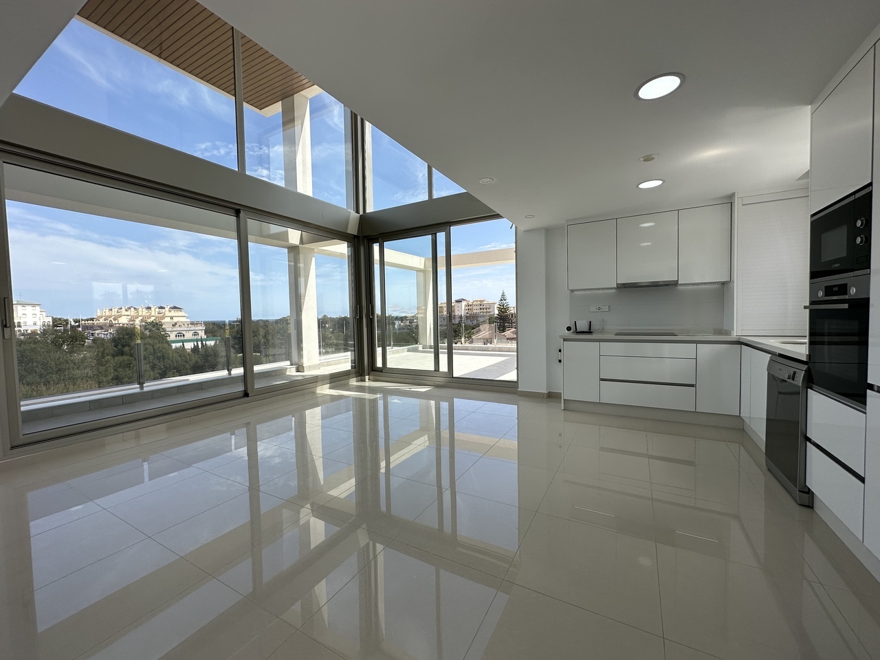 One of a kind Duplex Apartment for sale in the heart of La Zenia with impressive feature floor to ceiling windows, boasting spectaculare sea views. This brand new key ready 89m2 apartment is built over two levels with a huge living and dining area, open plan kitchen, double bedroom and guest bathroom all on the lower level. The apartment is located on the corner of the building and also enjoys a very large 56m2 private terrace which can be accessed from the main living area and ground floor bedroom. Upstairs there are 2 en-suite bedrooms both with sea views. This duplex apartment is sold equipped with kitchen appliances and white goods, pre-installation of air-conditioning, electric blinds, underfloor heating in the bathrooms along with underground parking and storage.