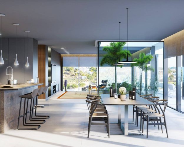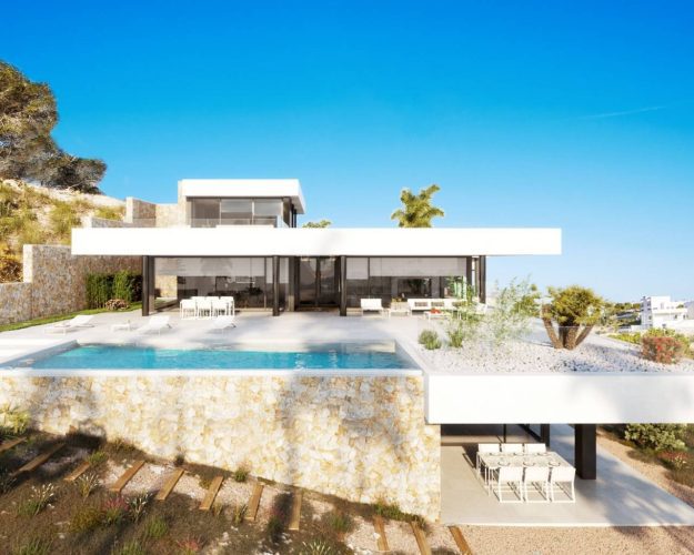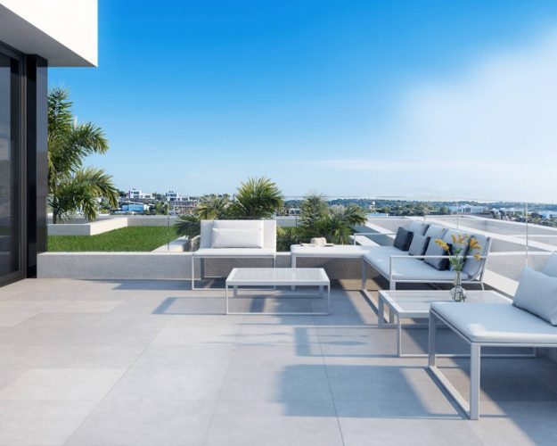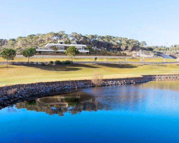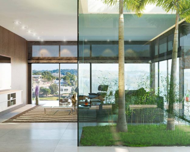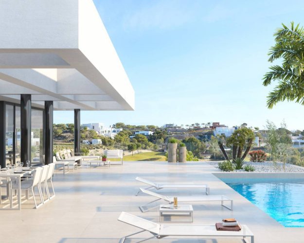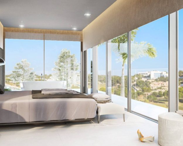 This luxury new build bespoke detached villa is off plan and will be built on a plot of 2,357 m2 with a build size of over 470 m2. The villa will have a beautiful open plan lounge/dining/kitchen area with large glass doors and windows and a feature glass interior patio garden area. There will be three bedrooms and three bathrooms and because the villa is not yet constructed you can choose to customise the villa to suit your own requirements. Large sun terraces on an elevated plot with outstanding golf views over the course of Las Colinas Golf Country Club Resort.