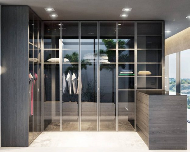 Wardrobes with Sliding/Swing doors in DM Smooth Lacquered Finish with Shelves, Drawers, Hanging Rail and Lighting