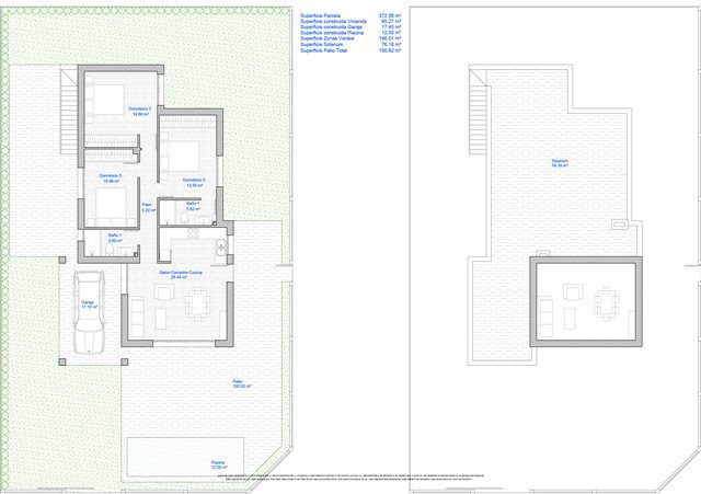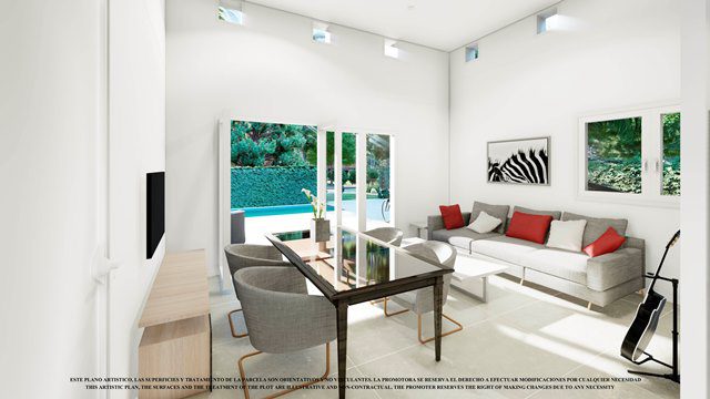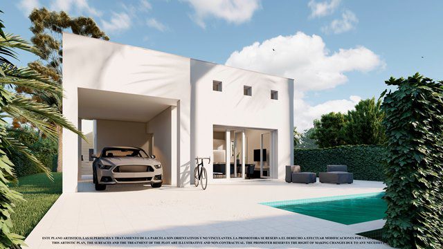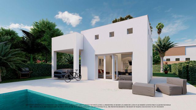 This villa is built on a plot of 350 m² and has a constructed area of 96.20 m². The villa has an open living room and kitchen overlooking the private pool. It has 3 bedrooms, one with an en-suite bathroom. The bedrooms have built-in wardrobes. There is a telephone and internet connection in every room. There is also a pre-installation for air conditioning. Next to the house there is a parking space for one car.