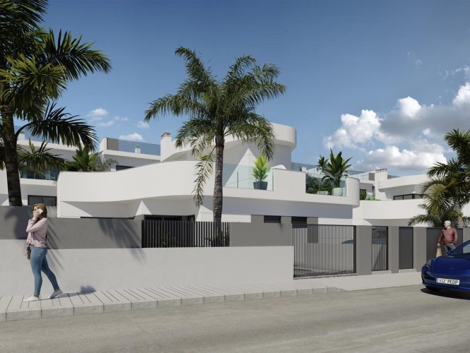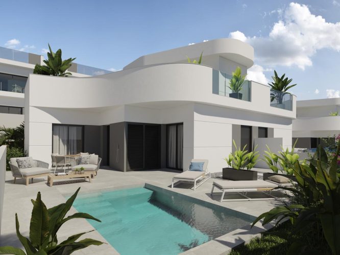 Semi-detached villas with 3 bedrooms, 3 bathrooms, large terrace (119 m2), solarium (57.24), private pool (10m2), garage and storage room. These villas are also located in an urbanization that has 2 communal swimming pools, so if you need it you can also cool off under the Spanish sun. All this in a strategic location not far from the center of Torrevieja and not far from the main roads AP7 and the N332, allowing you to travel in any direction with ease. It is best to go to the nearest beach (Playa de los Naúfragos) by car, bicycle or public transport, because it is just a bit too far on foot (3.5 km) or about a 45-minute walk. In addition, the university hospital of Torrevieja is not far away if you need help quickly, something that people do not always think about, but which is of course important. The Torrevieja region (Campoamor - Villamartin) is also known for its excellent golf courses and if you enjoy shopping there are also 2 shopping centers in the region. For the distance to Alicante airport (Elche), it takes you about 50 to 60 minutes by car.