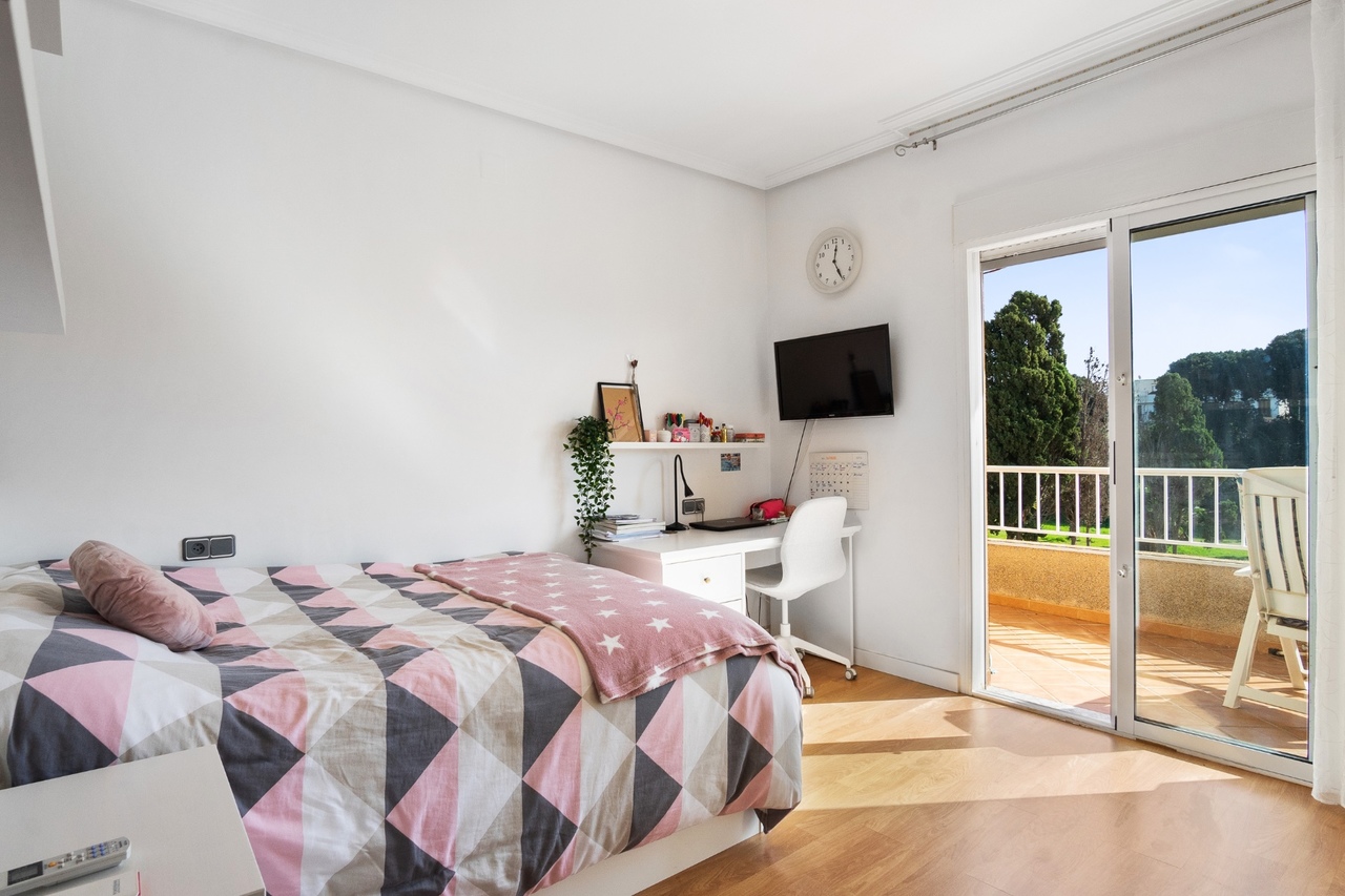On the upper floor, which you have access to from the beautiful granite staircase, you will find two double rooms and both with built-in wardrobes, one of the rooms also has access to a terrace with an unobstructed view over the green area and a complete bathroom with a large bathtub.