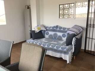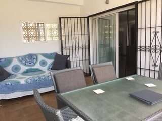 66 m2. Car gate and an entry phone system. Fully tiled for low maintenance. Much of the patio is covered, ideal for parking the cars or sitting in the shade. Stone table and chairs with lemon and orange tree planters. External staircase leads to the first floor living quarters. Very private.
