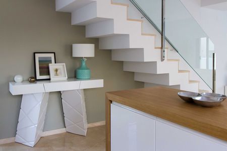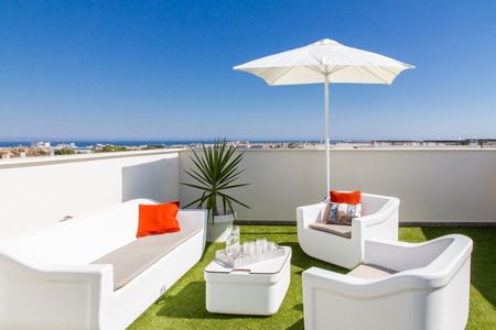 The modern villas consist of a spacious lounge and dining area, a separate kitchen, two double bedrooms and one bathroom on the ground level. Patio doors lead out onto the garden area featuring its very own swimming pool. Upstairs are two double bedrooms and two shower rooms, on of which is en suite. Patio doors lead onto a large terrace and external stairs leading up to a private solarium with sea views.