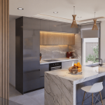• Dark grey kitchen units with Ascale by TAU large-format porcelain worktop. Low-flow single