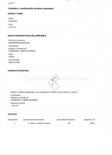 This plot is located in La Rambla Aljibe ( Lubrín ) in a quiet street. Almond trees are currently planned on the site.