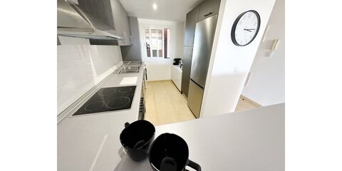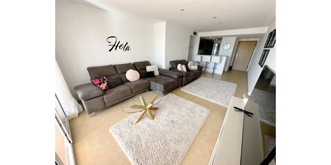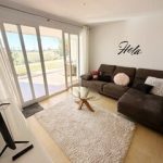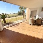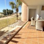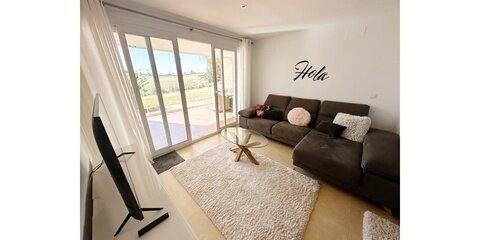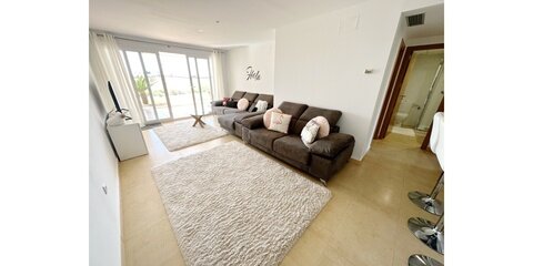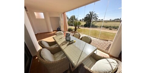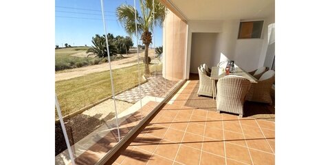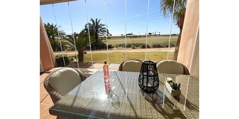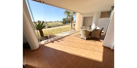 MGP Golf and Coastal are excited to exclusively offer this wonderful south west facing ground floor apartment for sale on the Mar Menor Golf Resort. The apartment has been immaculately maintained with the addition of glass curtains on the terrace. The property is being sold fully furnished with hot and cold aircon throughout and mozzie blinds on the kitchen window and bedroom patio doors. There is a secure allocated underground parking space with lift access to the apartment. It is situated in a fantastic location, a 6 minute walk to the onsite supermarket and MMGR club with mini golf, padel, gym and restaurant. On site you have the Ona hotel, clubhouse and several bars and restaurants situated on the Boulevard just outside the resort. Murcia airport is 20 minutes drive, Alicante and hour and the mar menor beach town of Los Alcazares a 10 minute drive. You enter the property into the sunny open plan lounge, diner and kitchen with breakfast bar. The modern galley kitchen has all mod cons. Patio doors lead to the large sunny terrace where you can enjoy frontline golf views, it is stunning. The owners have installed glass curtains to the terrace creating wonderful space for year round use. There are two large storage areas on the terrace which can be enclosed with shutters. There are two double bedrooms both with fitted wardrobes, the master having an ensuite bathroom. The guest bedroom has access to its own private terrace perfect for a morning coffee. You'll also find a further separate guest shower room. One of the communal pools is a short walk from the apartment as shown on location map. This is a wonderful property in a brilliant location. Contact the MGP office to book a viewing appointment.