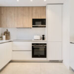 Natural textures and tones create a harmonious atmosphere and the apartment is sold fully furnished.
