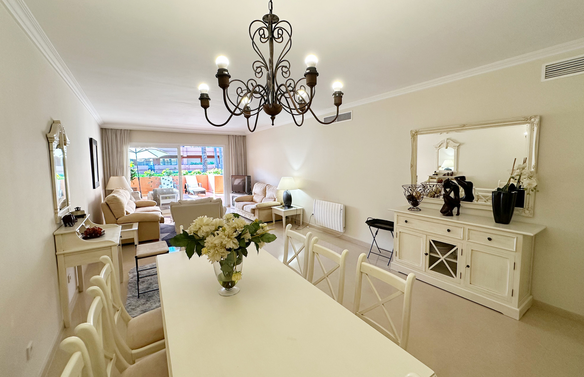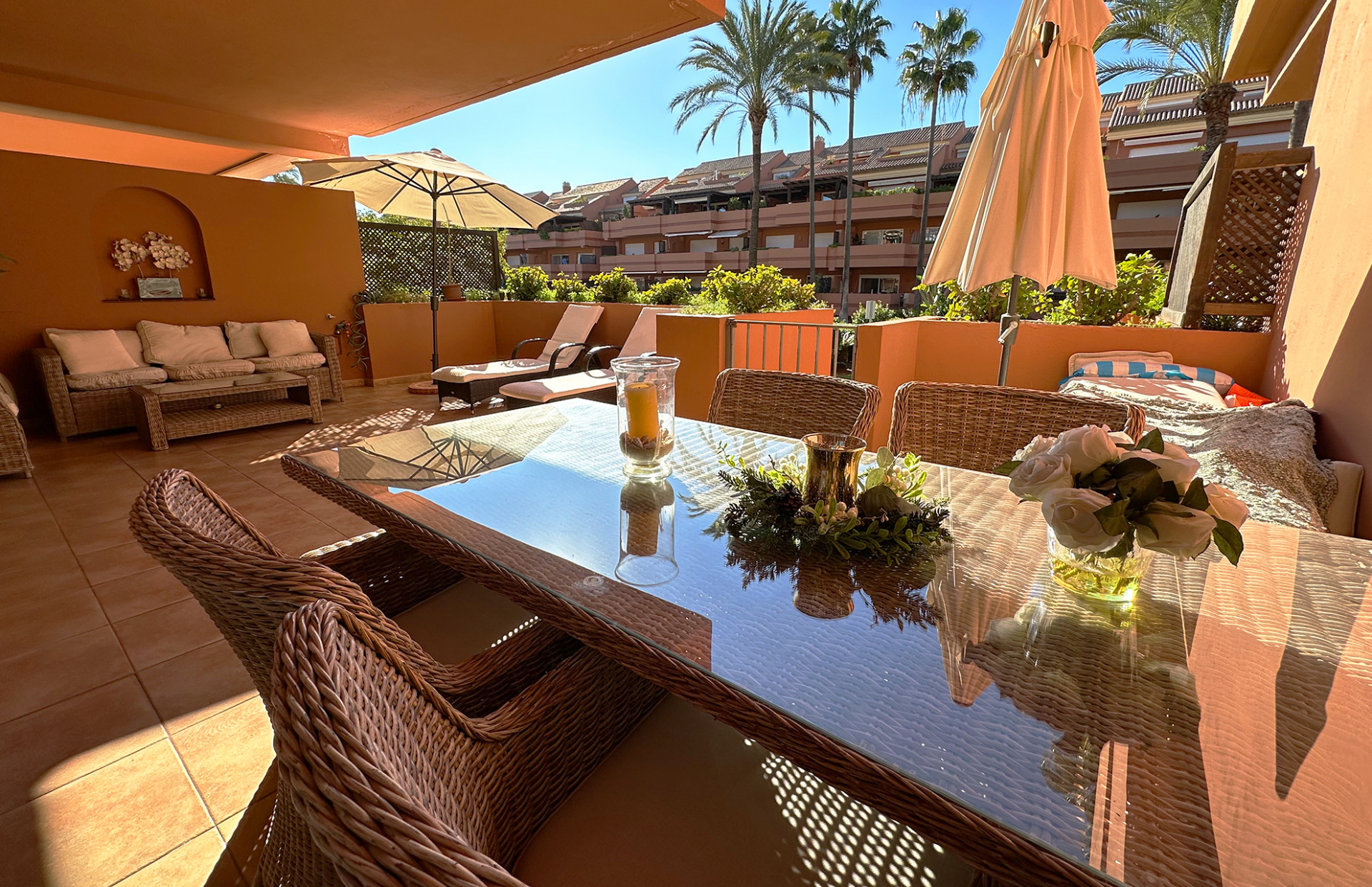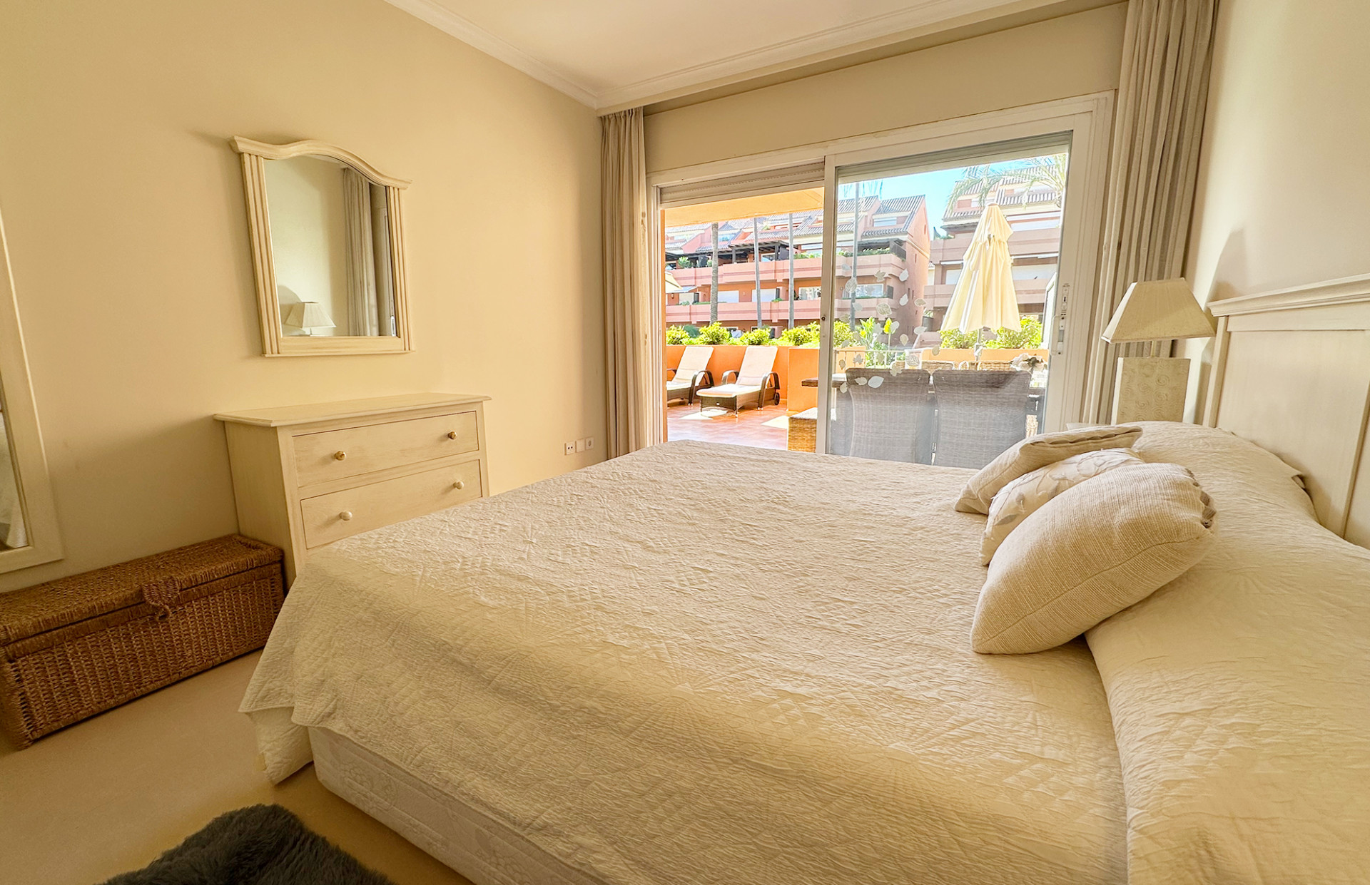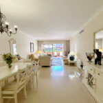 Nestled in the prestigious El Embrujo Playa community, located in the heart of Marbella - Puerto Banus, this elegant ground floor apartment offers a harmonious blend of comfort and convenience. Boasting a generous built area of 175m², including 130m² of interior space and a 40m² terrace, this property is an ideal choice for those seeking a luxurious yet practical living environment. The apartment features two spacious bedrooms and two well-appointed bathrooms, designed to provide maximum comfort and privacy. The interior is adorned with marble floors, enhancing the sense of sophistication throughout the living spaces. The living room and dining room are thoughtfully laid out, creating a seamless flow for both relaxation and entertaining. From the living areas, one can enjoy tranquil garden views, adding a touch of serenity to everyday life. The property’s outdoor spaces are equally impressive, with a private terrace that offers ample room for alfresco dining or simply unwinding in the Mediterranean climate. Residents also benefit from access to a communal pool and beautifully maintained communal gardens, perfect for leisurely afternoons. The gated community ensures a secure and peaceful environment, complemented by a 24-hour security service for added peace of mind. Situated in a prime location, this apartment is just a short distance from the sea and beach, as well as being conveniently close to shops, restaurants, schools, and the vibrant town and port of Puerto Banus. Excellent transport links further enhance the property’s accessibility, making it an exceptional choice for both permanent residence and holiday retreats. Additionally, the property includes a private garage, offering secure parking and added convenience.