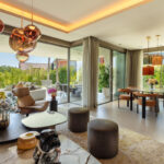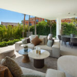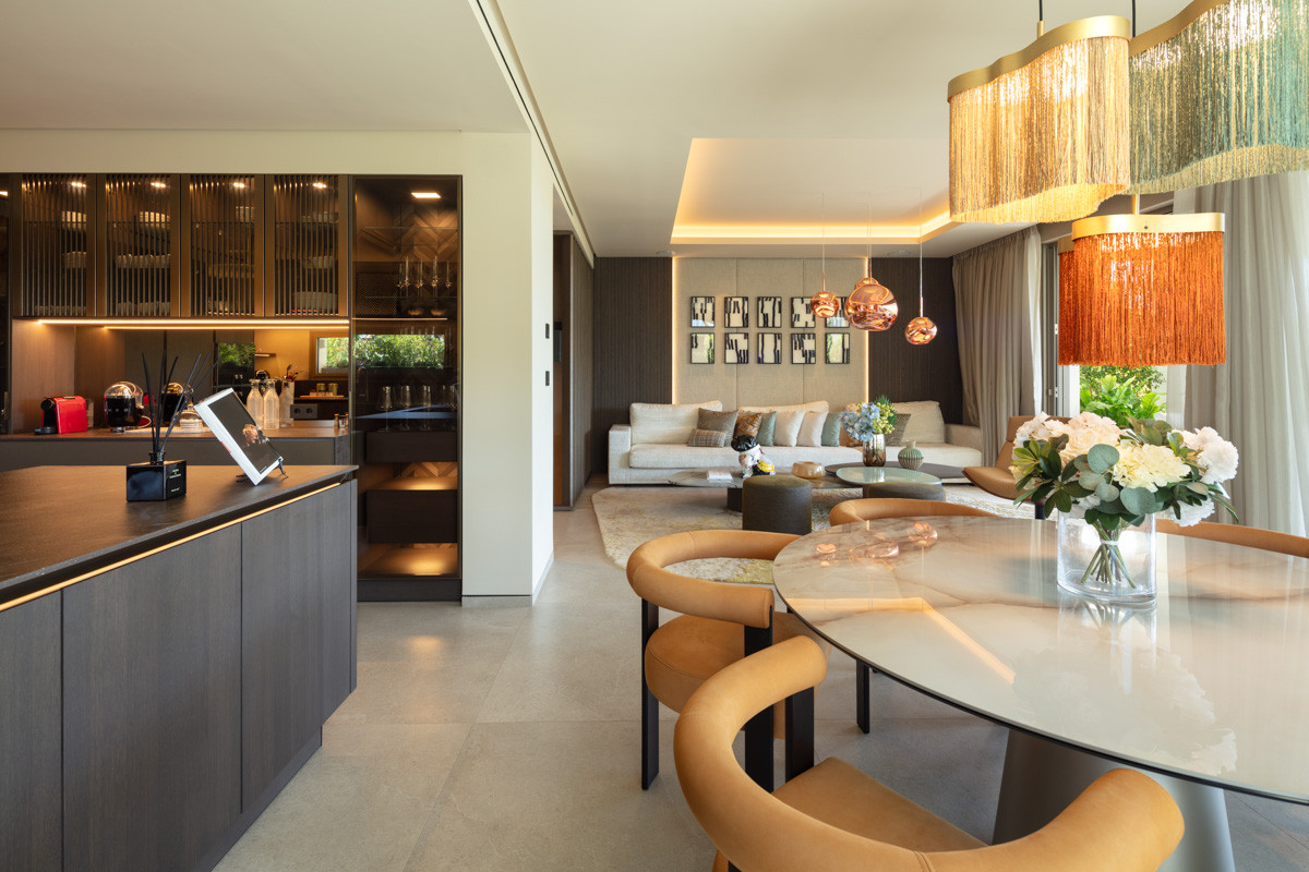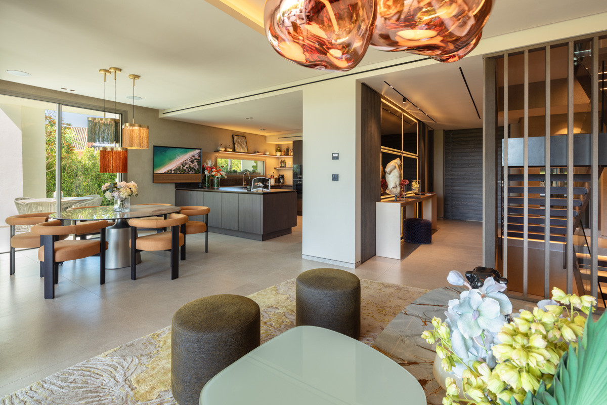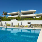 This residence stands as a striking, newly-constructed modern semi-detached villa, part of an exclusive project featuring 11 prestigious residences. Situated within a gated community in Nueva Andalucia, it presents a distinctive and captivating approach to modern architecture, characterized by clean lines and a commanding geometric facade. The exterior, adorned with neutral-toned natural materials, exudes an added touch of elegance.