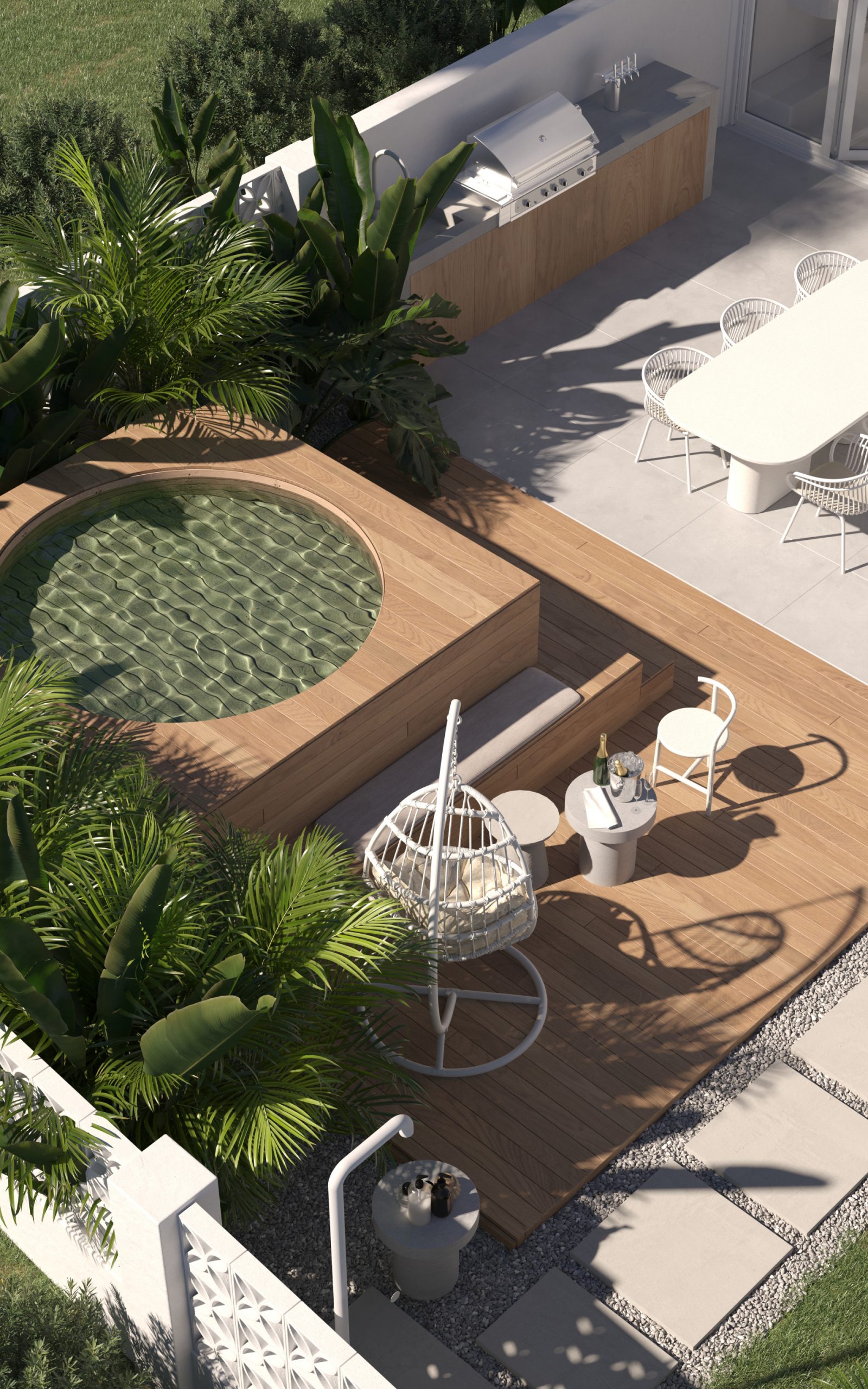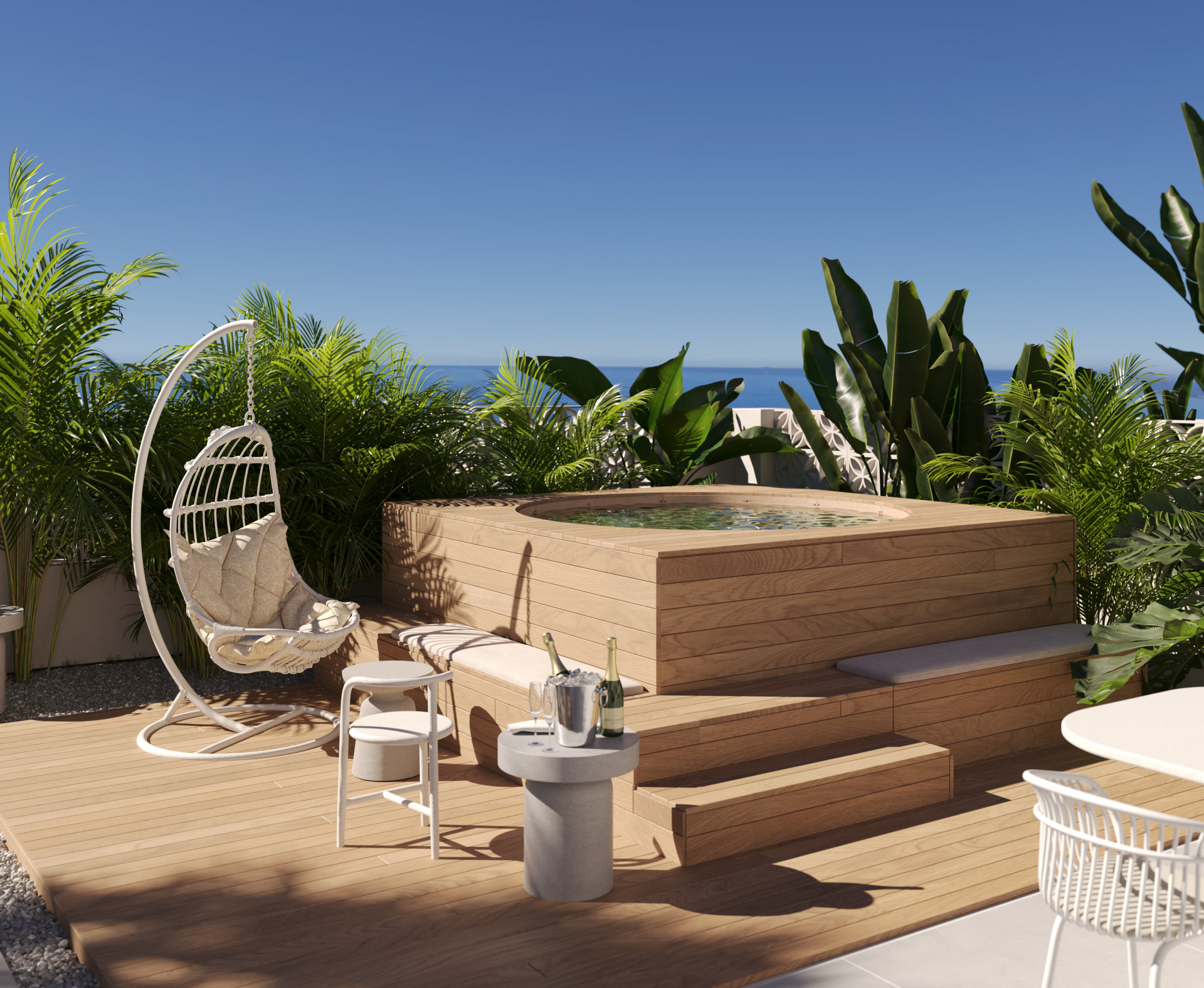 The expansive private garden is an ideal setting for outdoor gatherings, boasting an outdoor kitchen and a jacuzzi for either hosting lively barbecues or simply basking in the sun. Alongside your personal outdoor haven, you'll also enjoy access to a communal pool and immediate proximity to the ocean.