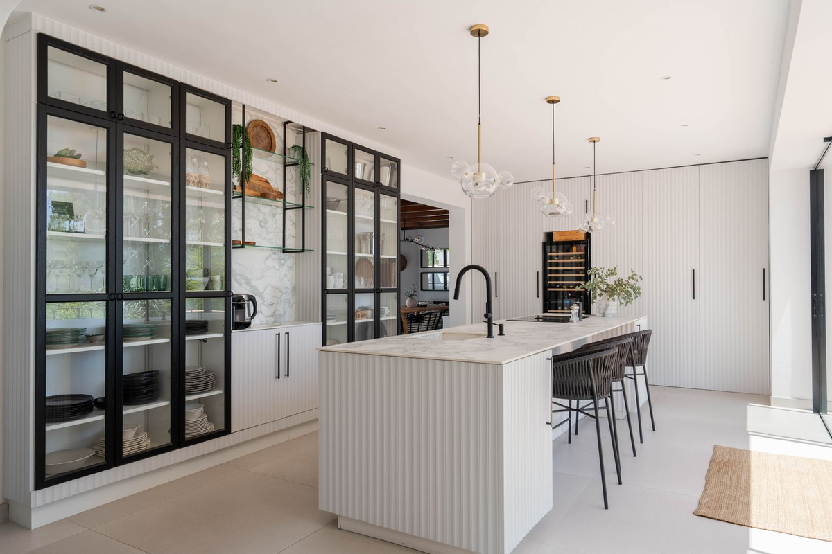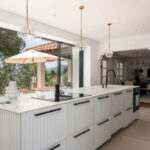 Entering the villa, the main floor has a large space divided into several areas. The fully equipped kitchen with state-of-the-art appliances has a custom-made island.