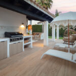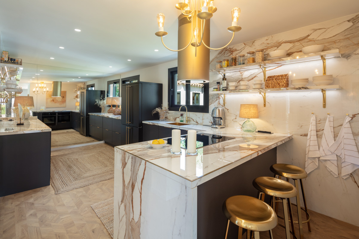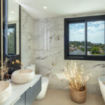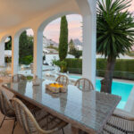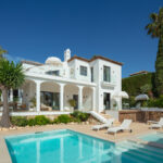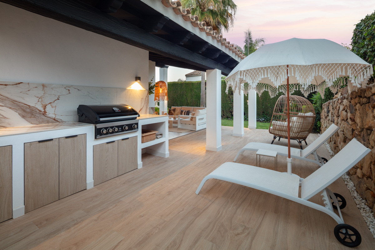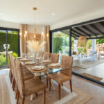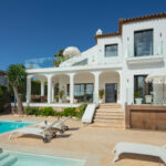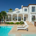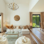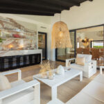 This villa extends a warm welcome to Southern Spain, boasting a striking traditional facade in bright white that immediately captures attention. The arched terraces outside bestow a distinctive charm, paying homage to its time-honored style. inside, a contemporary and modern aesthetic prevails, a testament to the recent refurbishment. The modern boho-chic ambiance is characterized by its light tones, creating an open and harmonious atmosphere. The double-height ceiling in the living area further enhances the sense of space, imbuing it with an airy quality.