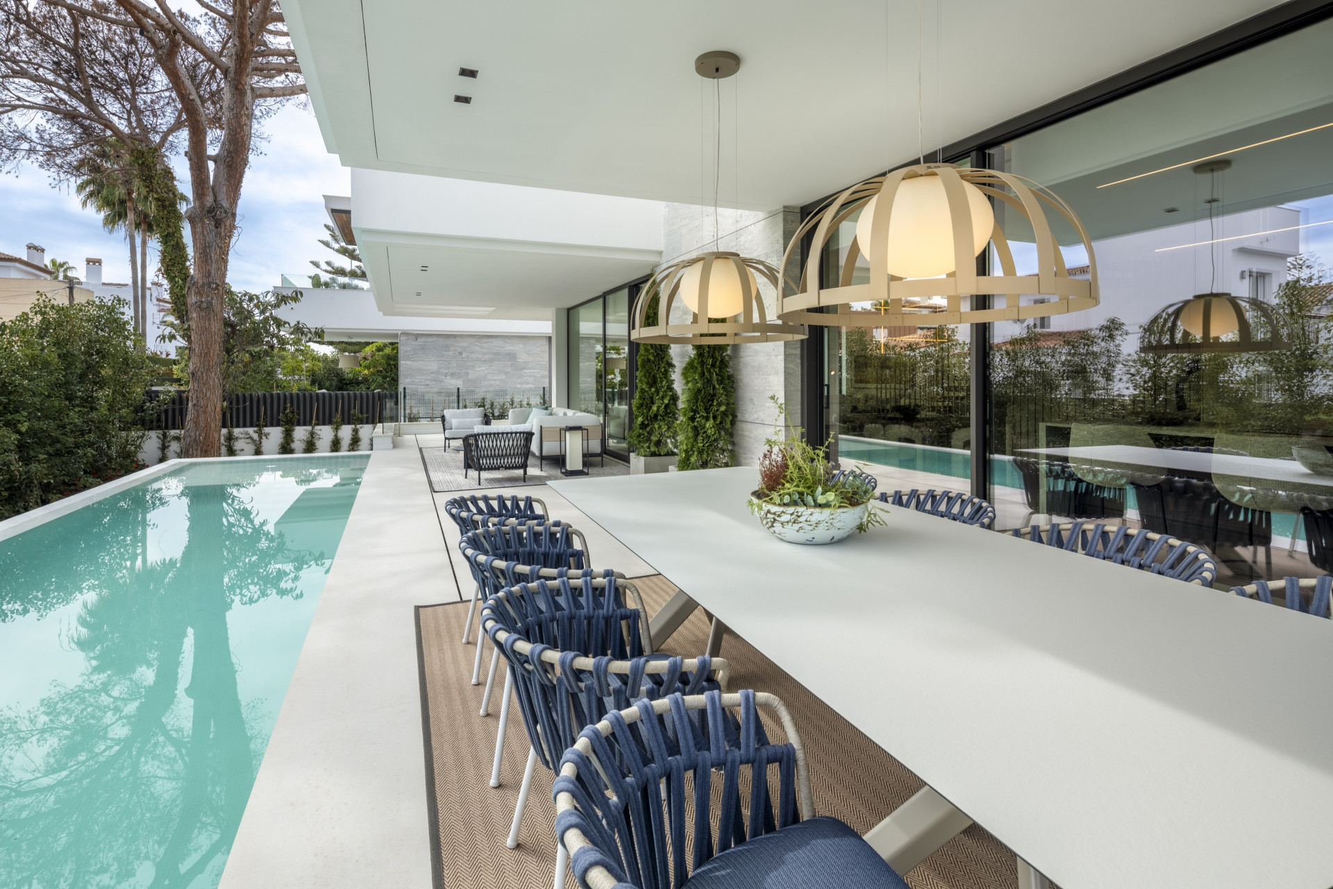 This exquisite luxury villa, located in the prestigious area of Marbella, Malaga, offers an unparalleled living experience. Spanning an impressive 463m², this newly built property is set on a generous 616m² plot and features five spacious bedrooms, each with its own en-suite bathroom, as well as an additional toilet for guests. The villa is designed with comfort and elegance in mind, boasting a range of high-end amenities, including air conditioning, underfloor heating (partial), and a state-of-the-art heating and cooling system to ensure year-round comfort. The interior of the villa is a masterpiece of modern design, featuring marble floors throughout and a fully fitted kitchen equipped with top-of-the-line appliances. The open-plan living and dining areas are perfect for entertaining, while the cosy fireplace adds a touch of warmth and sophistication. The property also includes a study room and an office room, providing ample space for work and relaxation. For leisure activities, residents can enjoy the private gym, sauna, and indoor heated pool, all designed to promote a healthy and luxurious lifestyle. Outdoor living is equally impressive, with a private terrace and roof terrace that offer breathtaking views of the sea, golf course, and marina. The beautifully landscaped garden surrounds a stunning private pool, perfect for cooling off on warm days. The covered terrace provides an ideal space for al fresco dining or lounging, while the proximity to the beach ensures easy access to sun and sand. Additional features include a laundry room, storage room, and private garage, enhancing the convenience and functionality of this remarkable property. This villa is not just a home; it is a lifestyle choice that embodies luxury and comfort. With excellent condition throughout and being fully furnished, it is ready for immediate occupancy. The property is also equipped with modern conveniences such as internet Wi-Fi and mains electricity and water supply. This is a unique opportunity to own a piece of paradise in Marbella, close to the beach and all local amenities.