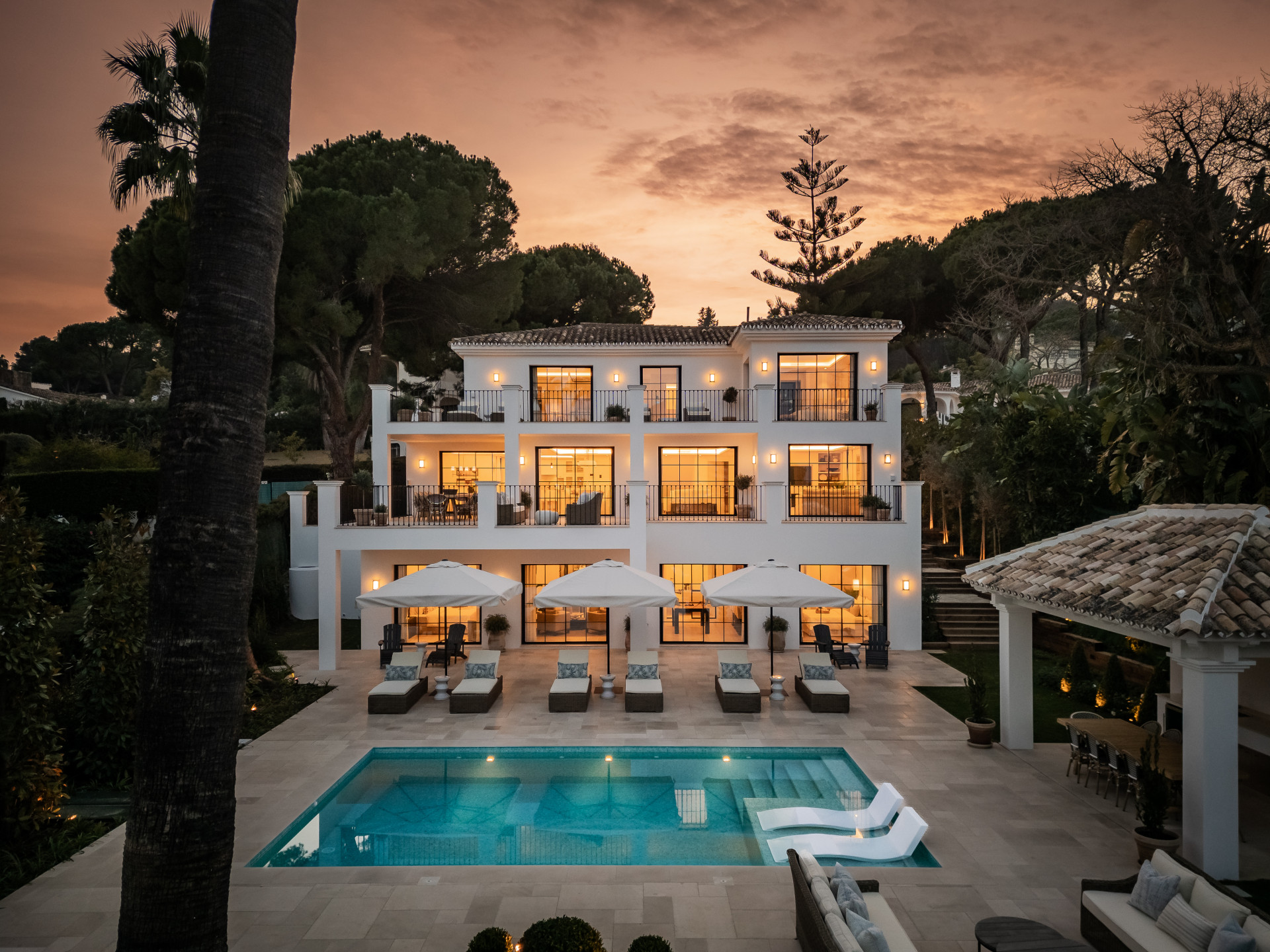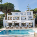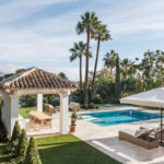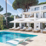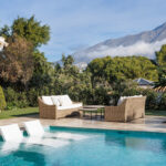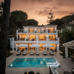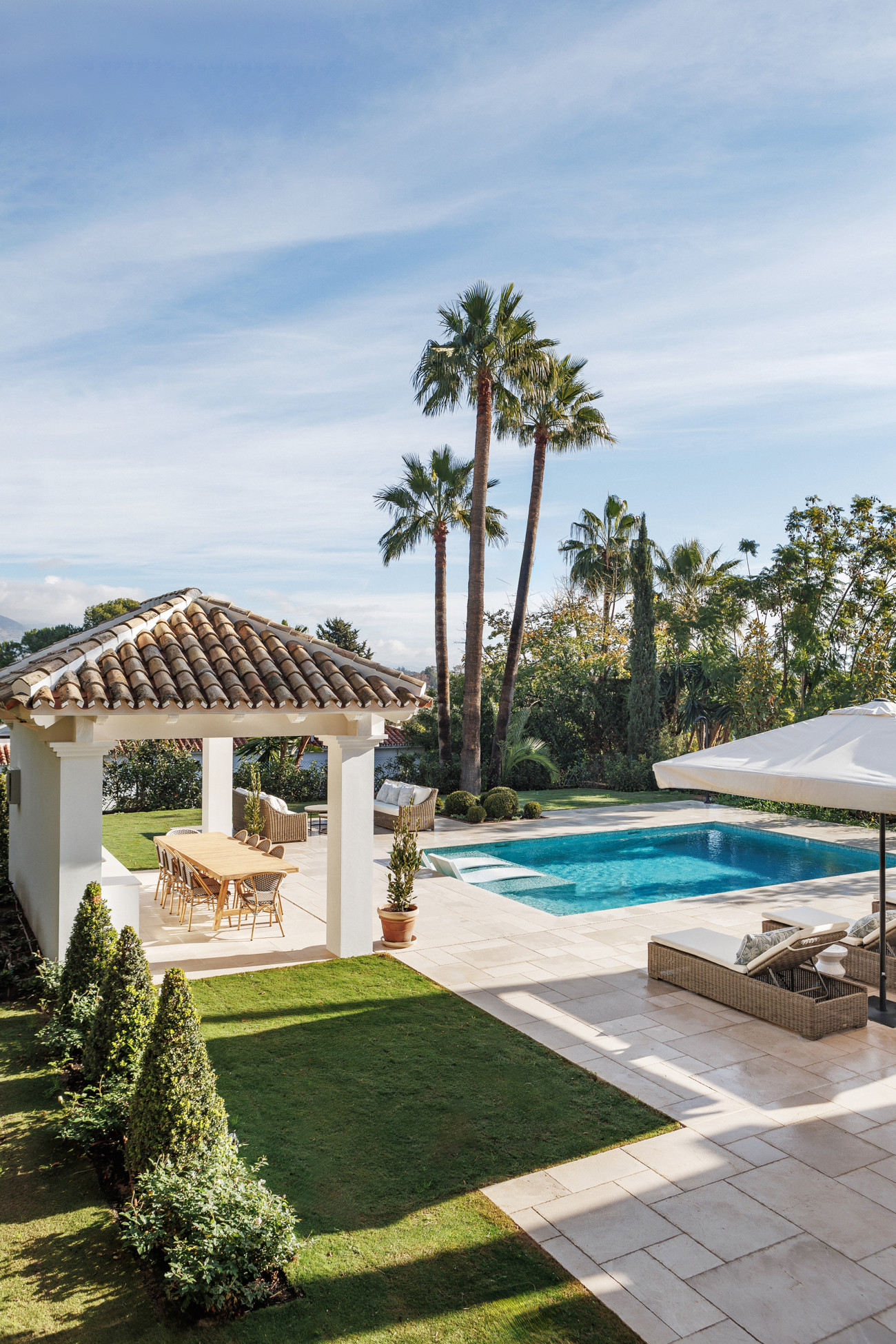 Completing the residence is a thoughtfully landscaped garden inspired by a fusion of modern and botanical aesthetics. A central focal point is a contemporary pool with integrated seating, surrounded by carefully selected greenery and fruit trees. The outdoor space is enriched with multiple seating areas, providing the perfect setting for daytime relaxation or evening soirees.