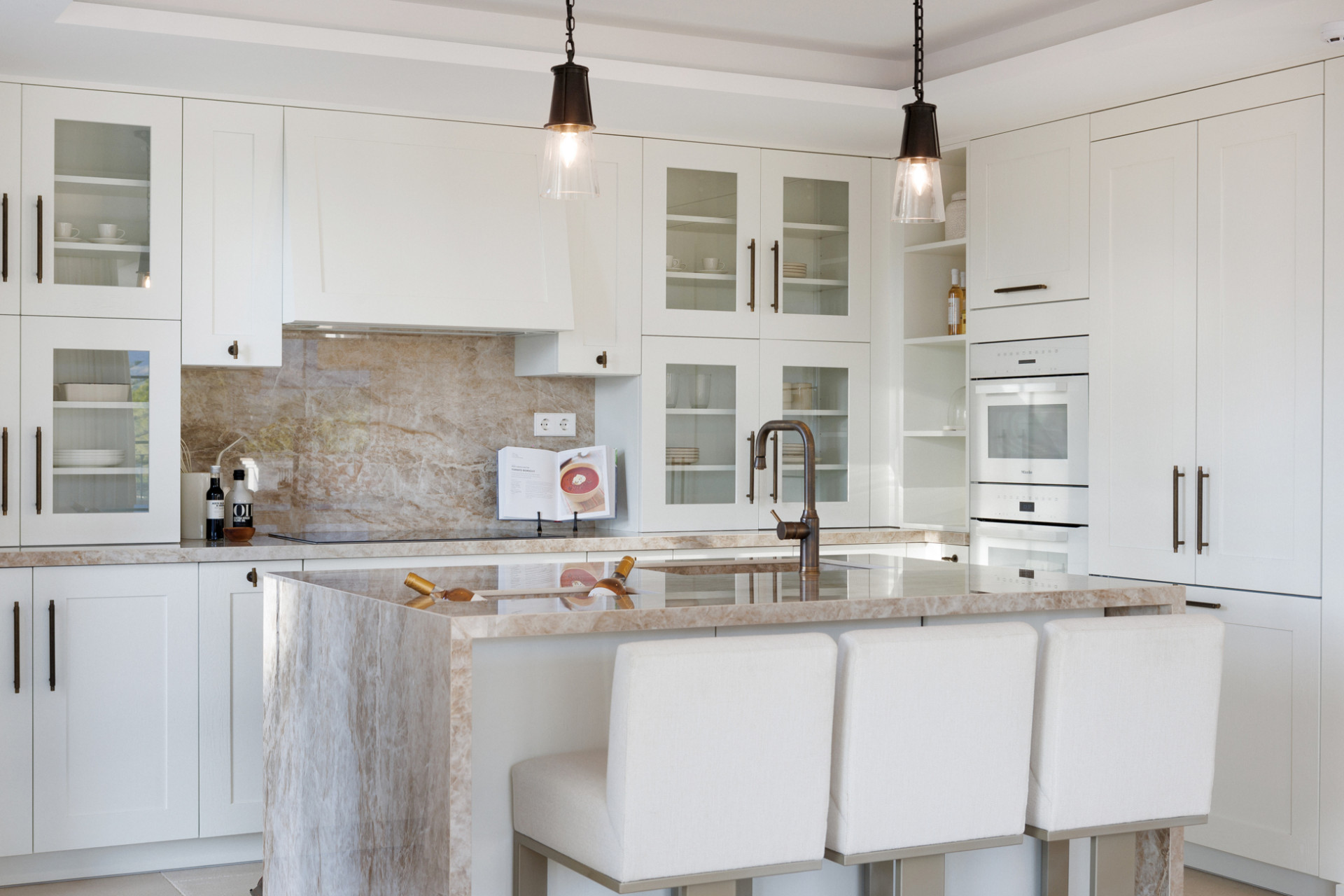 Upon entering, you are greeted by a striking entrance hall with staircase finished with a natural hand carved stone flooring. The staircase leads to the upper level, comprising two bedrooms both ensuite and with access to a wide terrace with panoramic views to the golf valley and the sea. The master bedroom offers a private sanctuary, providing an intimate space for relaxation.