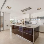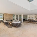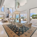 The villa’s interiors are expansive and thoughtfully designed with natural textures, elegant finishes, and soaring ceilings that enhance the sense of space. The main living areas seamlessly integrate with outdoor terraces, offering panoramic views and an effortless flow for entertaining. The upper floor features bedrooms with private terraces, while the modern kitchen is fitted with premium appliances and a glass-framed dining area.