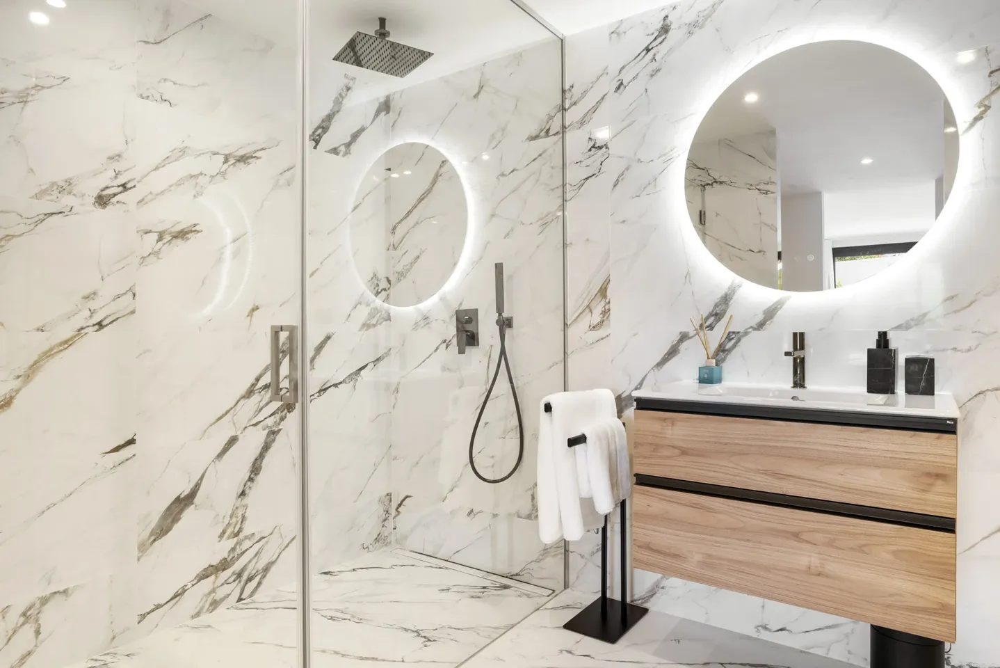 Sold fully furnished and move-in ready, the home includes built-in LED-lit wardrobes, a covered garage for one car with an electric charging point, and additional parking space for up to three vehicles within the gated property.