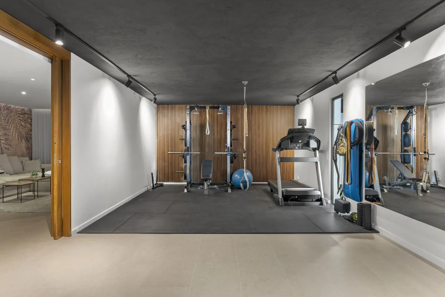 Upstairs, two spacious bedrooms each offer en-suite bathrooms and direct access to a sunlit terrace, ideal for relaxing or taking in panoramic views. The lower level includes a guest suite with en-suite bathroom, a private gym, laundry room, and a garage accommodating at least two cars.
