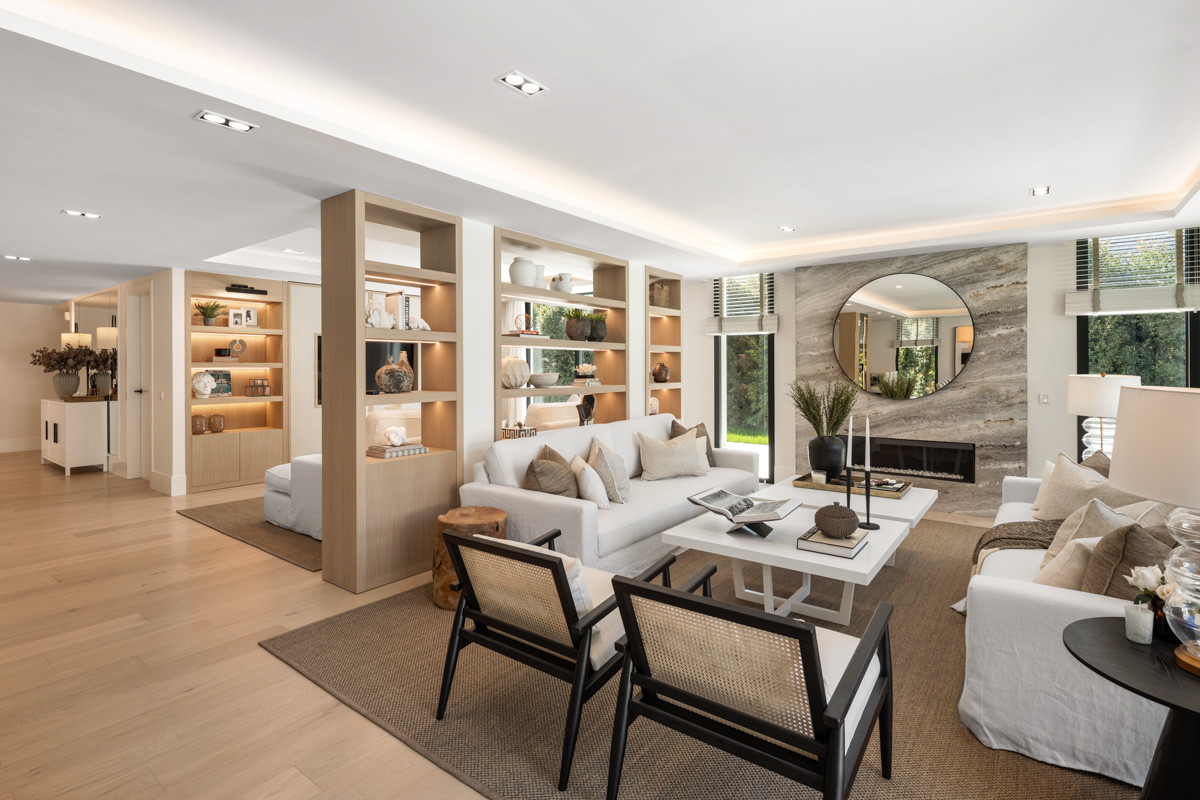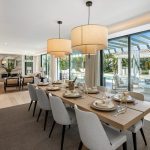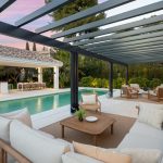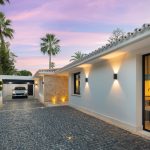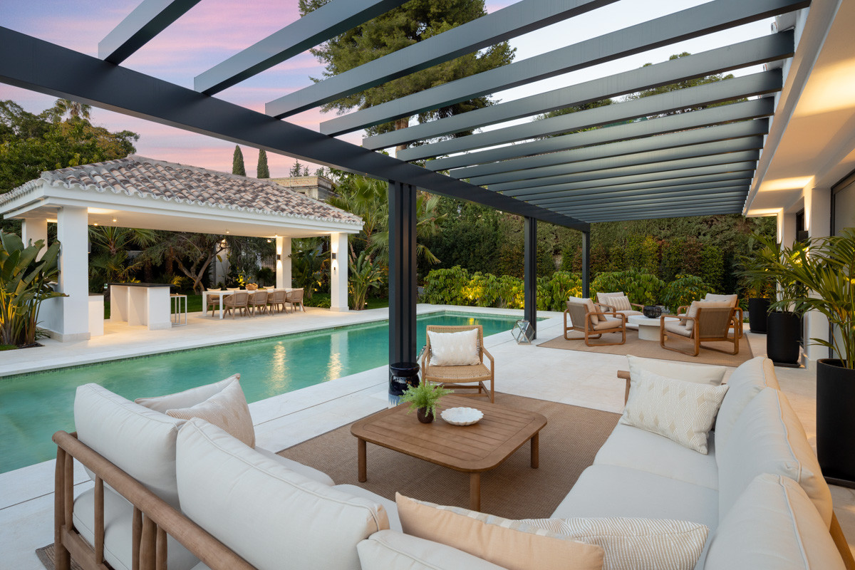 Nestled in the prestigious enclave of Las Brisas del Golf in Nueva Andalucia, Marbella, this modern villa stands as a testament to luxurious living infused with Andalusian charm. This recently constructed property is a striking example of contemporary architecture, harmoniously integrated with its expansive surroundings. Set on a generous plot of 1,250m², the villa is enveloped by meticulously landscaped gardens, featuring lush trees that provide both tranquillity and privacy, making it a perfect retreat. The villa is designed with outdoor indulgence in mind, boasting a private pool and extensive terraces totalling 408m² that are ideal for al fresco dining and relaxation. A charming pergola by the poolside is equipped with an outdoor kitchenette and barbecue, making it an ideal spot for entertaining guests. The villa’s layout is crafted to seamlessly integrate indoor and outdoor spaces, promoting a true indoor-outdoor lifestyle. On the ground floor, an open-plan design allows each area to flow effortlessly into the next, with a spacious living room and dining room that offer stunning views of the golf course, garden, and pool. Inside, the villa spans 380m² and features four bedrooms, each with its own en-suite bathroom, ensuring comfort and privacy for all residents. The master suite includes a luxurious walk-in closet and a private balcony, offering serene views of the surrounding landscape. The property also includes a modern, fully equipped kitchen that caters to all culinary needs, along with an office room that provides a quiet space for work or study. Additional amenities include a private garage, a basement for extra storage or potential development, and a convenient guest toilet. The villa's prime location offers proximity to a variety of local amenities, including shops, schools, restaurants, and the beach, as well as being close to golf courses and a children's playground. This property perfectly balances modern luxury with the convenience of nearby urban facilities, making it an ideal home for those seeking a sophisticated lifestyle in one of Marbella's most sought-after areas.