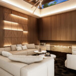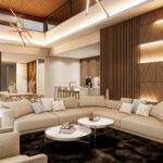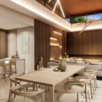 The living areas are embraced by floor-to-ceiling glass walls, adorned with graceful wooden accents and curated, elegant furnishings. A chef's kitchen, a work of art in itself, harmonizes effortlessly with its surroundings, featuring a sprawling breakfast bar. The formal dining area provides a picturesque backdrop of the inviting outdoors.