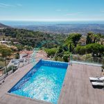 The property sits on a plot of 1420 m2 with panoramic views of the sea and the mountains. It has a garden area, large terraces at different levels, a