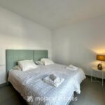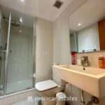 The main bedroom includes built-in wardrobes, air conditioning, and an en-suite bathroom with a bathtub and double basins, along with sea views. The second bedroom also has built-in wardrobes and air conditioning. In addition to the en-suite, there is a separate family bathroom with a walk-in shower.